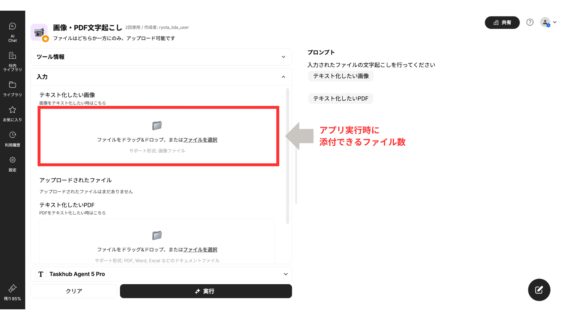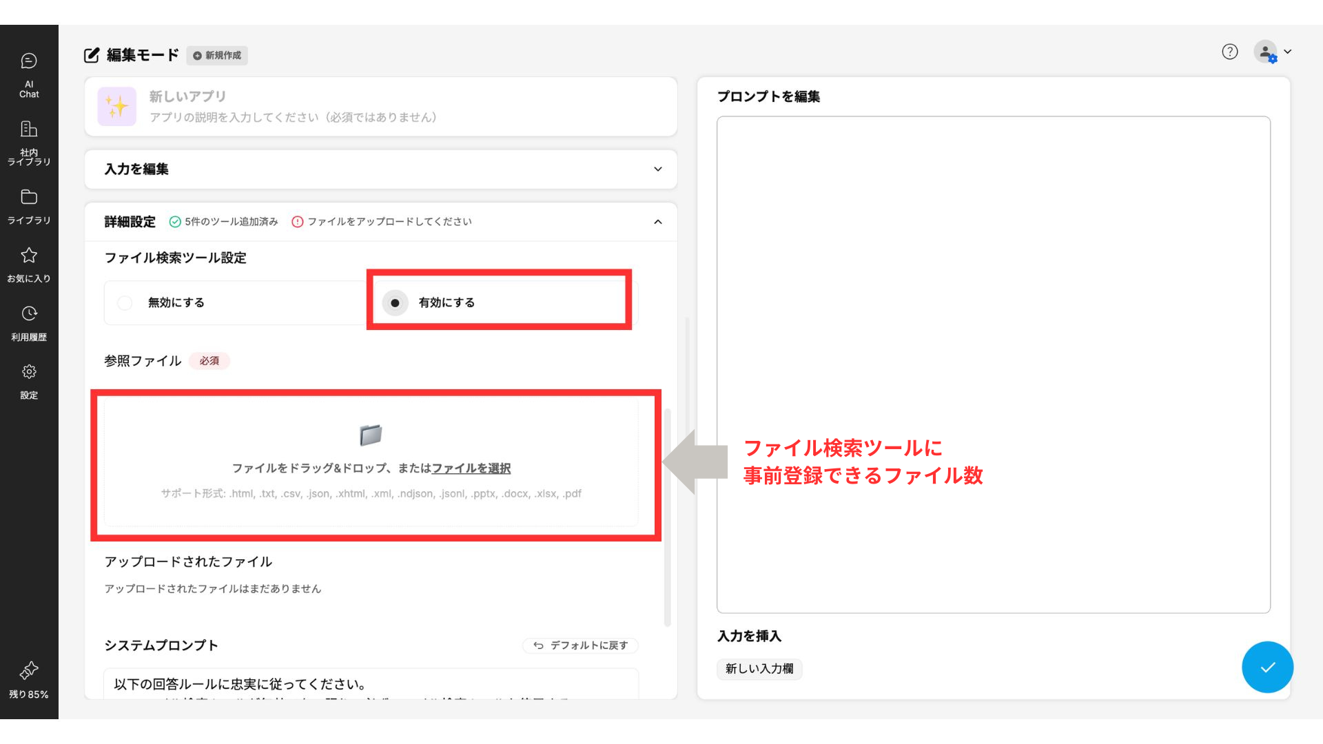 エージェントアプリでは、ファイル検索ツールに登録できるファイル数とアプリ実行の際に添付できるファイル数でそれぞれ上限が異なります。