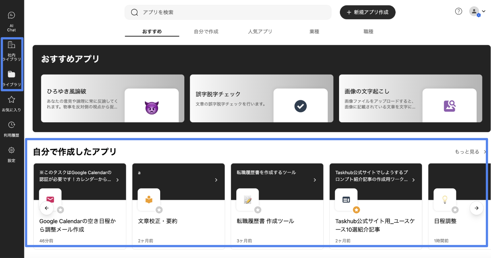 マイアプリは最も制限された公開設定で、アプリの作成者のみが閲覧・使用できます。マイアプリはライブラリの「自分で作成したアプリ」セクションに表示されます。この設定は、個人的なプロジェクトや開発中のアプリに適しています。