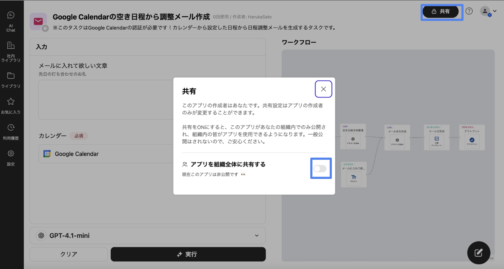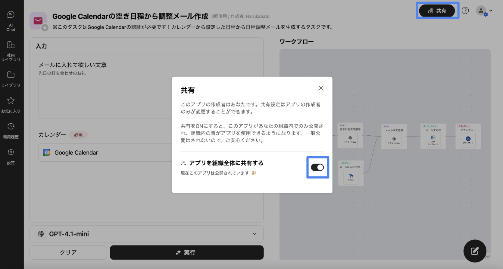 組織内(会社アカウント)のユーザーは、組織公開アプリとマイアプリの2つのタイプを作成することができます。アプリの公開範囲を変更するには、自分で作成したアプリを開き、右上にある「共有」ボタンをクリックします。表示されるスイッチで公開範囲を切り替えることができます。スイッチが左側(オフの状態)の場合、そのアプリはマイアプリとして保存されます。スイッチを右側(オンの状態)に切り替えると、アプリは組織公開アプリとして保存されます。