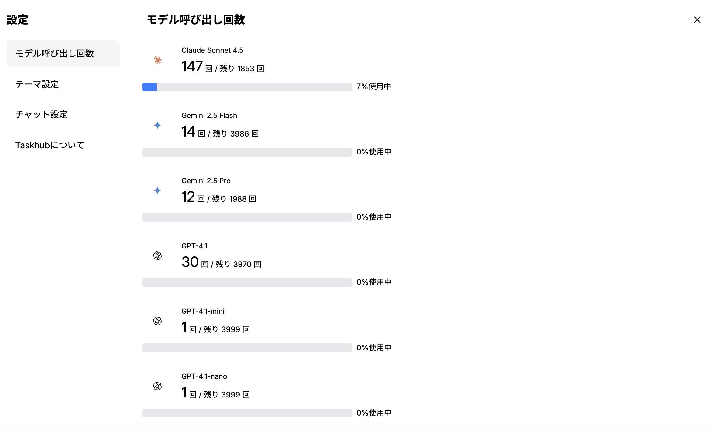 ご利用のプランに応じて、各LLMモデルをあと何回呼び出すことができるかの残量が表示されます。
