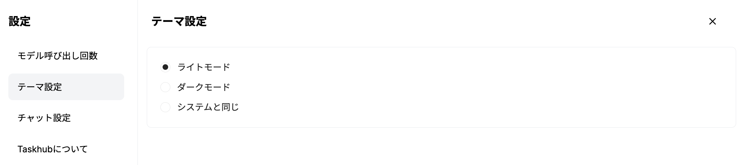 このオプションを選択すると、Taskhubのテーマがお使いのデバイス(PCやスマートフォン)のシステム設定と自動的にリンクします。デバイスがライトモードに設定されていればTaskhubもライトモードに、ダークモードに設定されていればダークモードに切り替わります。