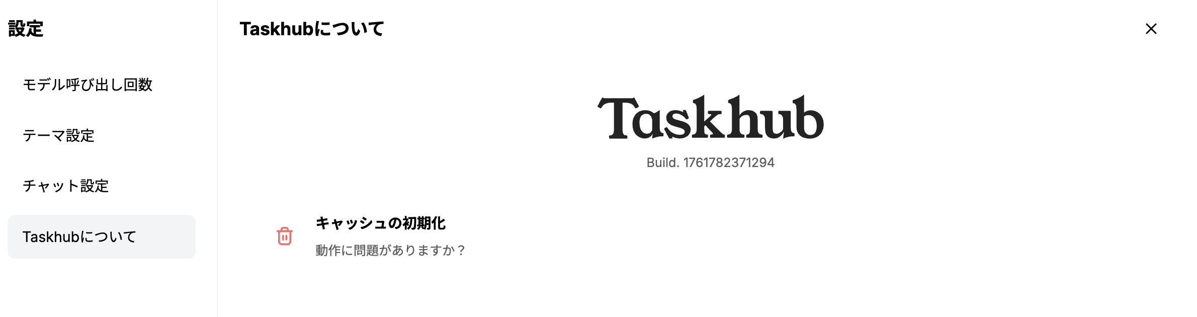 個人設定画面には、「モデル呼び出し回数」「テーマ設定」「チャット設定」「Taskhubについて」の4つの主要な項目があります。