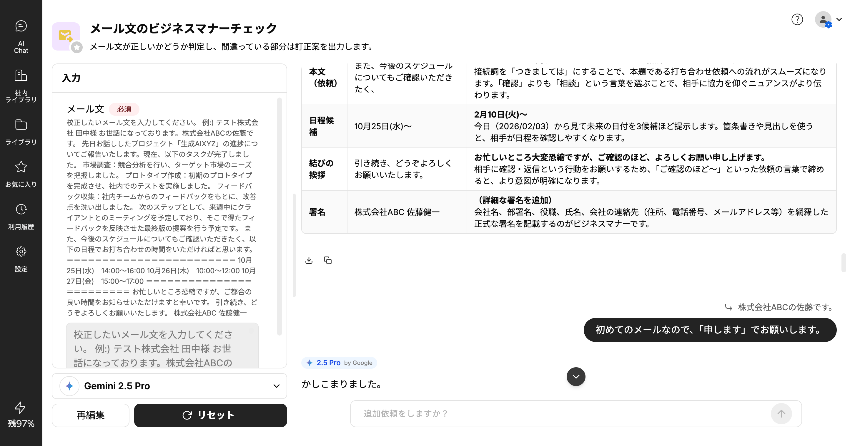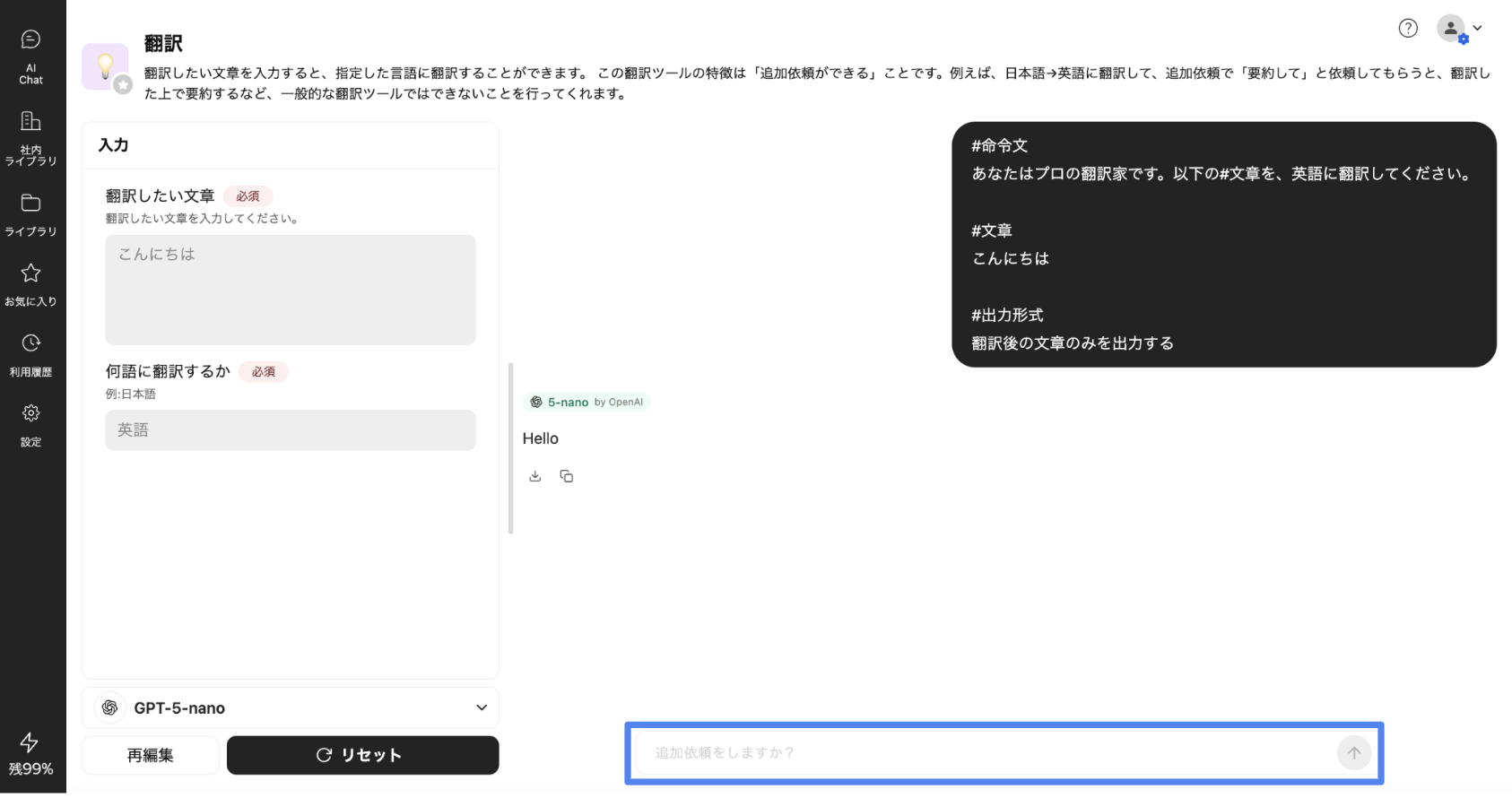 プロンプトアプリでは、実行後に追加依頼をすることが可能です。アプリの実行が完了し、結果が表示された後、画面右下にテキストボックスが表示されます。このボックスから自由に追加依頼を送信することができます。