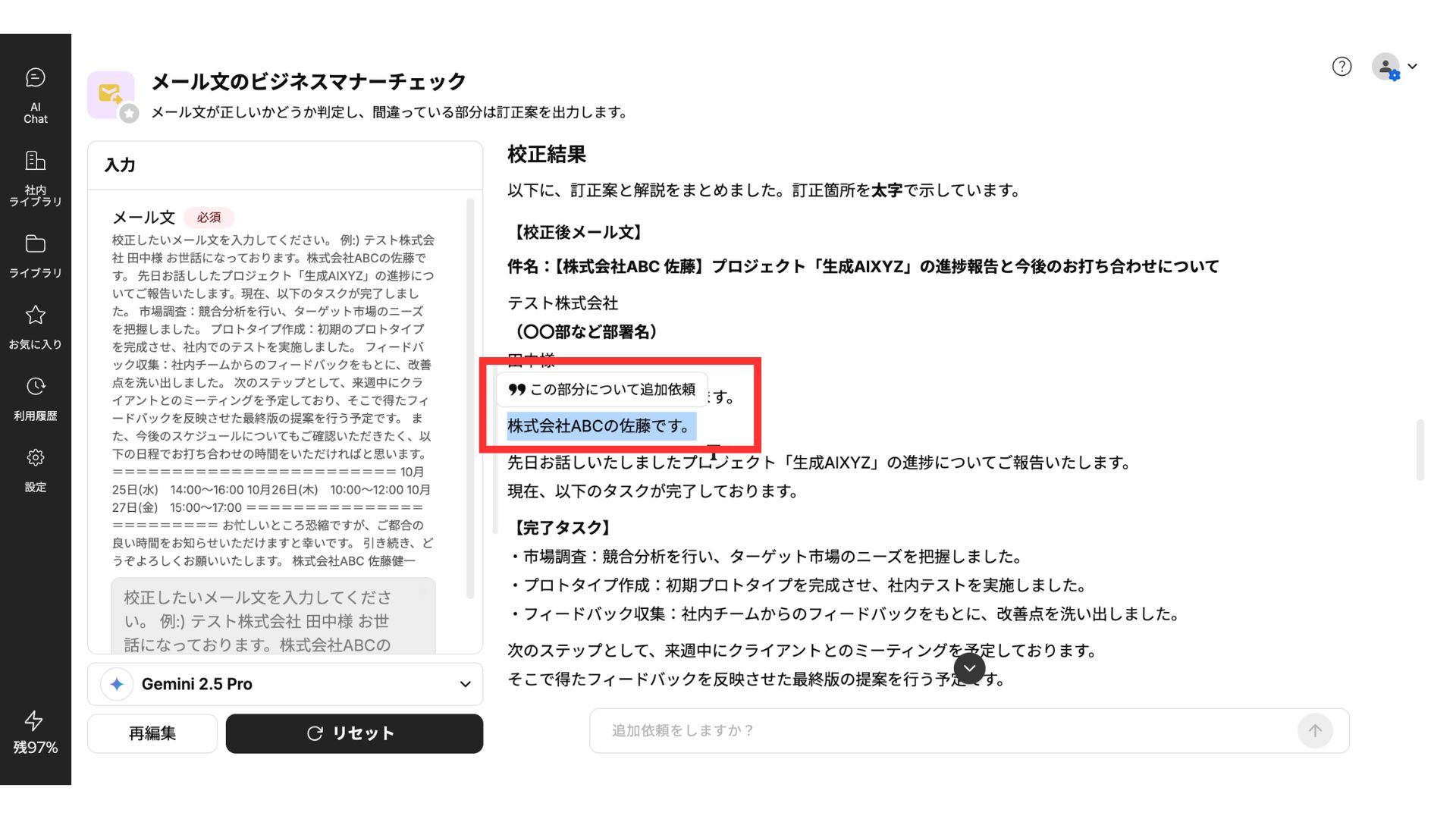 AIから出力された回答の内、追加依頼を行いたい部分を選択します。「この部分について追加依頼」というボタンが表示されるため、クリックし、追加依頼を行うことで部分指定を行った追加依頼を実行できます。