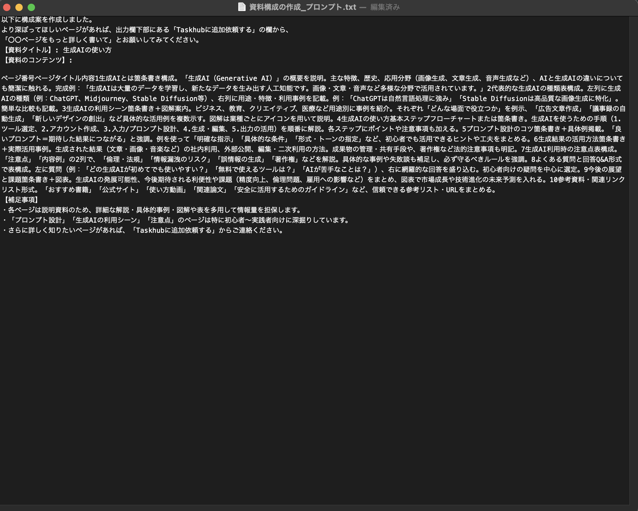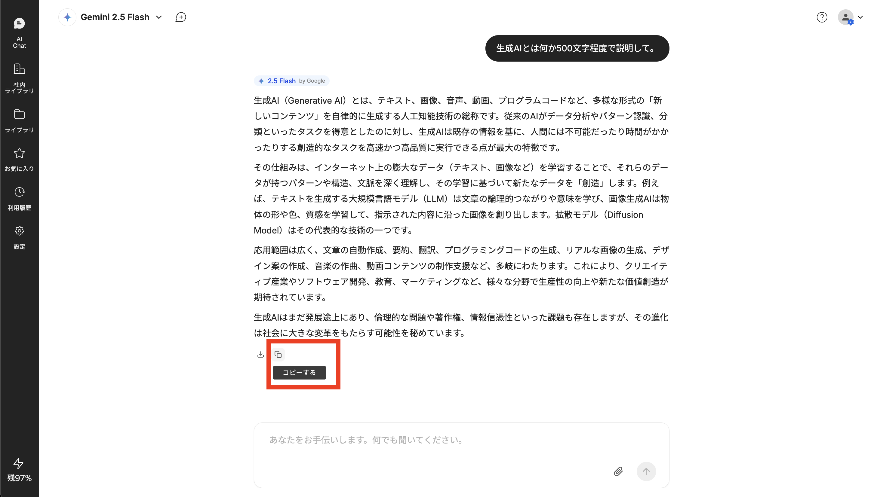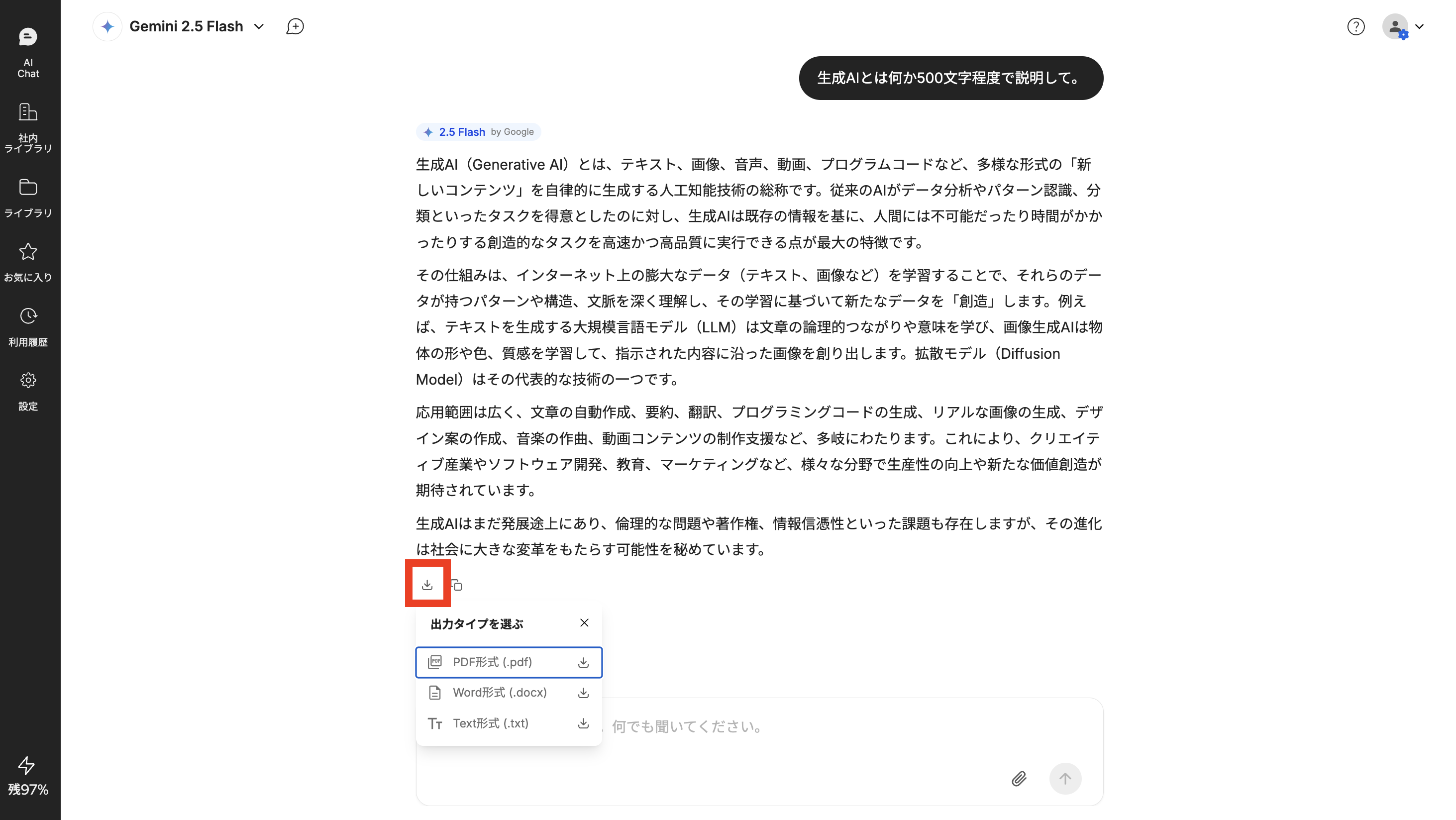 ※会話全体の履歴(追加の依頼内容を含む)を一括で保存することはできません。コピー・ダウンロードできるのは、AIの個別の回答結果のみとなります。(2025/12/11 時点)