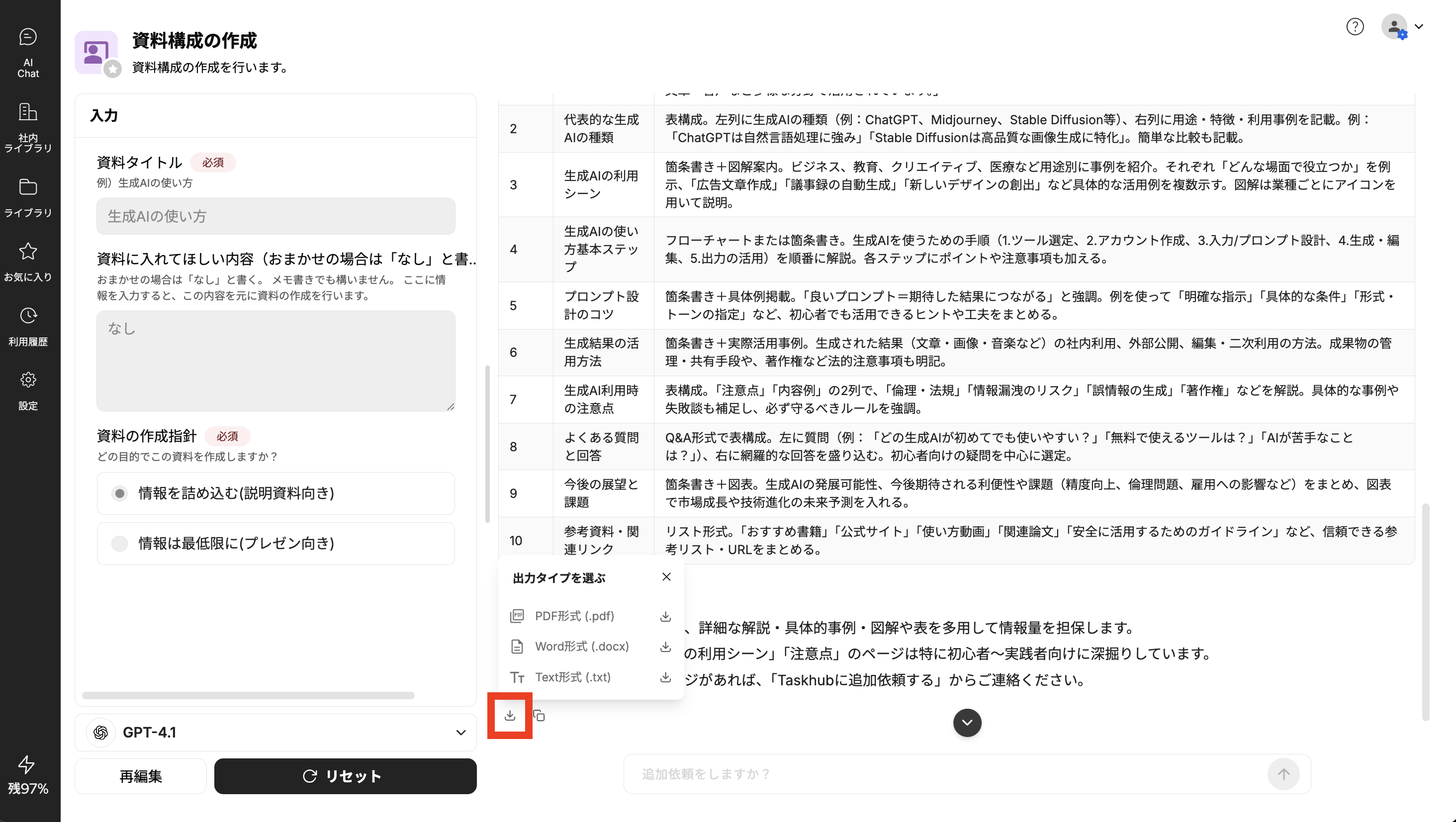 ・ダウンロード:.pdf, .docx, .txtのいずれかでダウンロードできます。