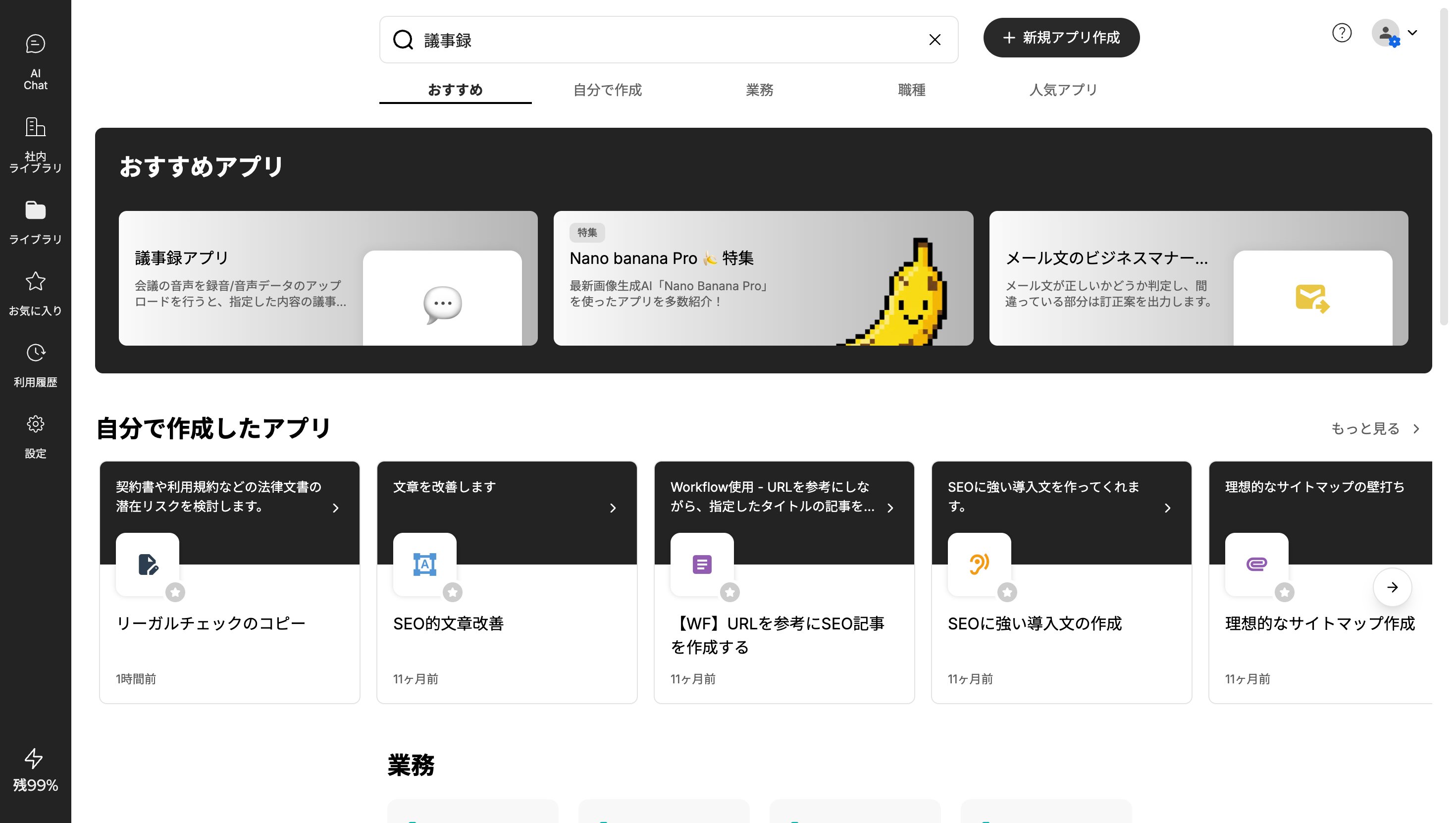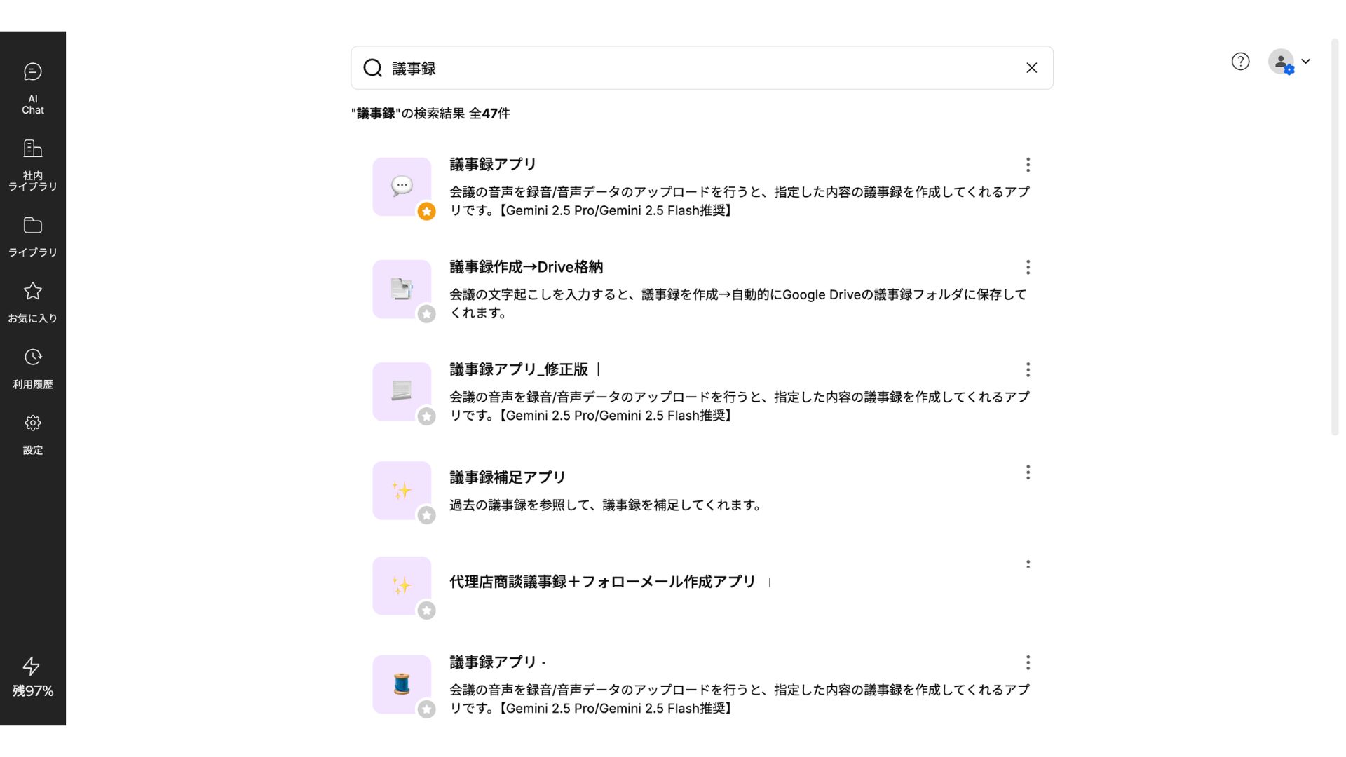 例えば、「議事録」と入力し検索を行うと、タイトルや説明文に「議事録」という単語が含まれるすべてのアプリが検索結果として表示されます。