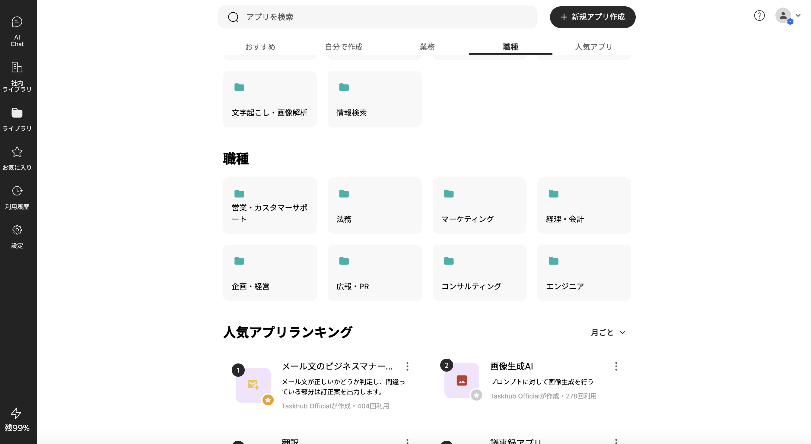 また、Taskhubは職種別のフォルダも提供しています。各職種フォルダには、その職種で特に役立つアプリが集められています。これにより、ユーザーは自分の職種に特化したアプリを簡単に見つけ、業務効率を向上させることができます。
