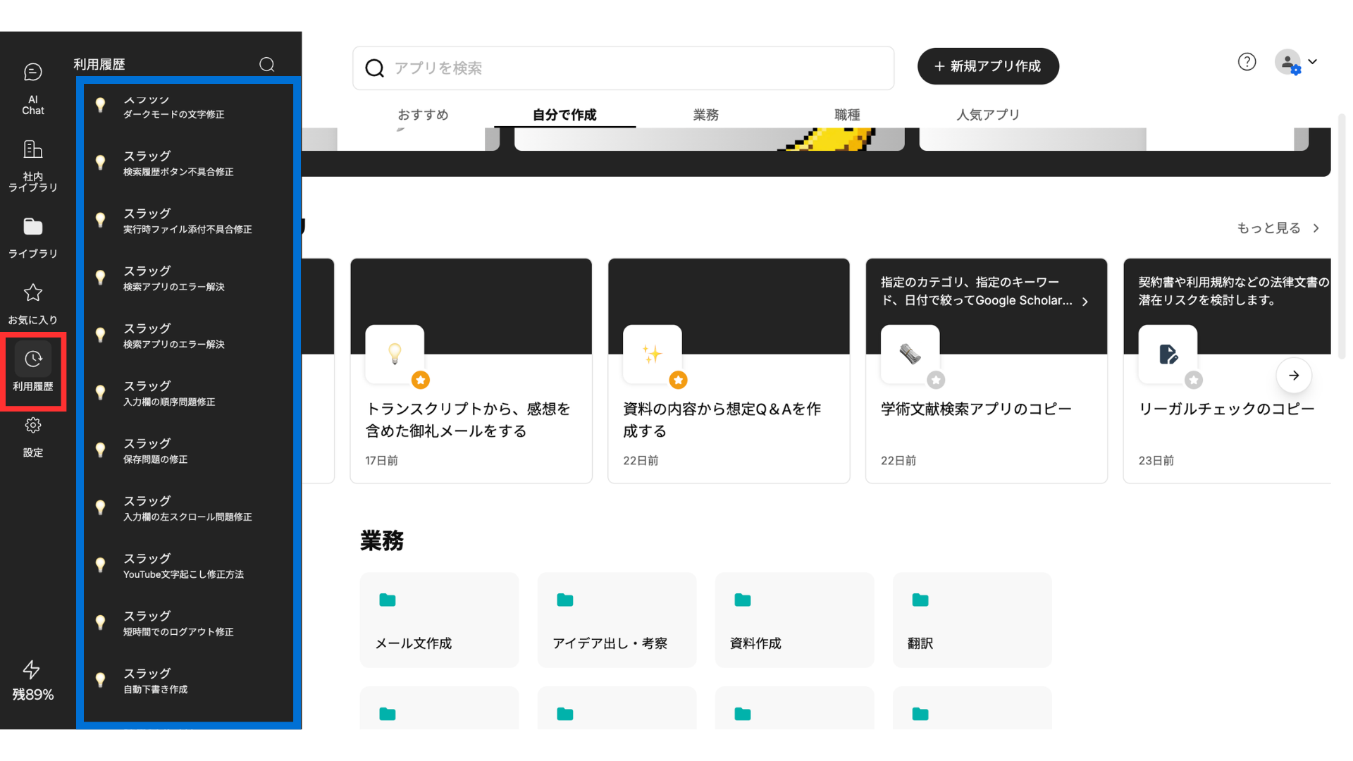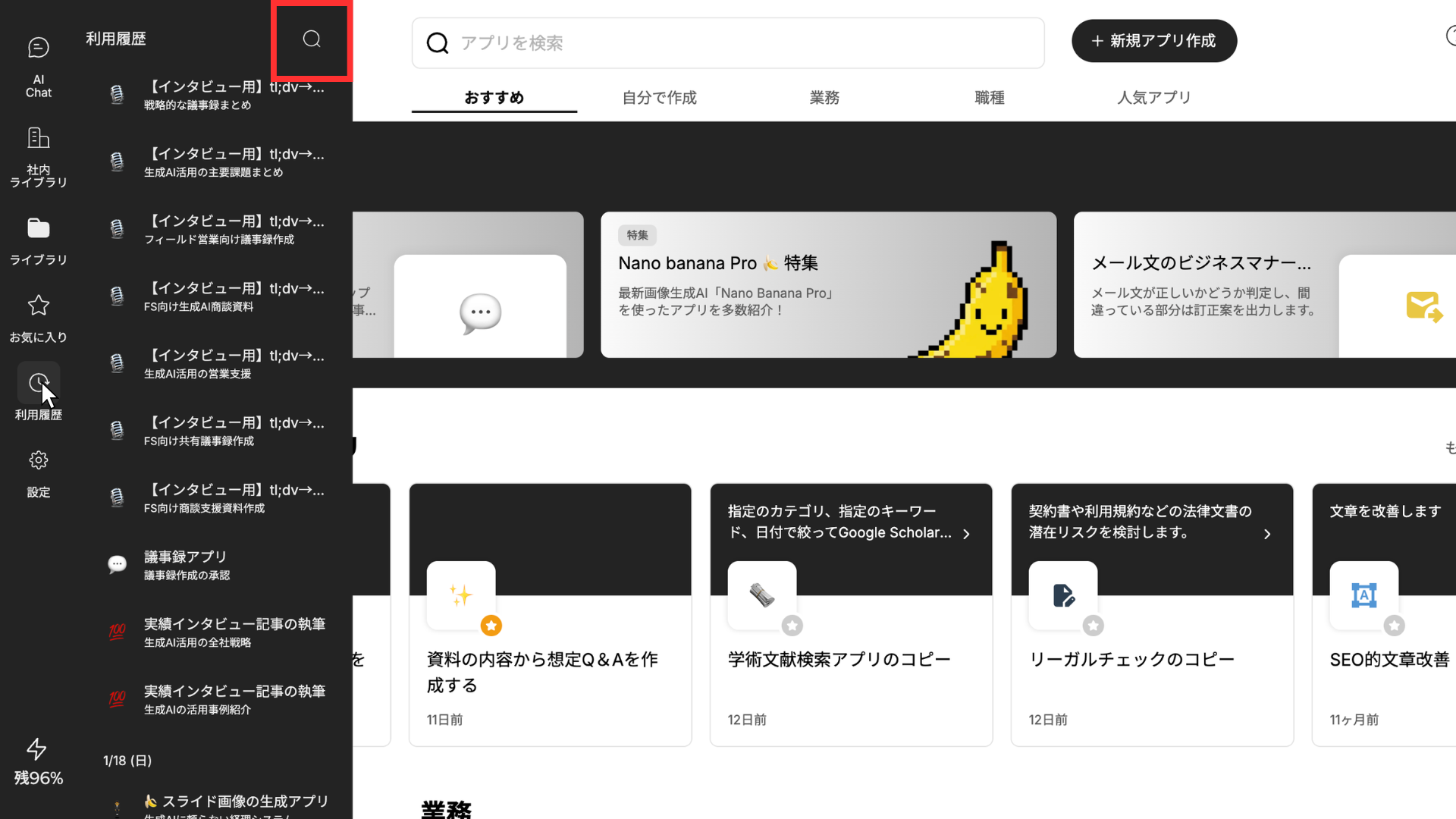 Taskhubでは、各アプリやAI Chatの過去の実行状況や得られた回答を利用履歴の形で管理することができます。