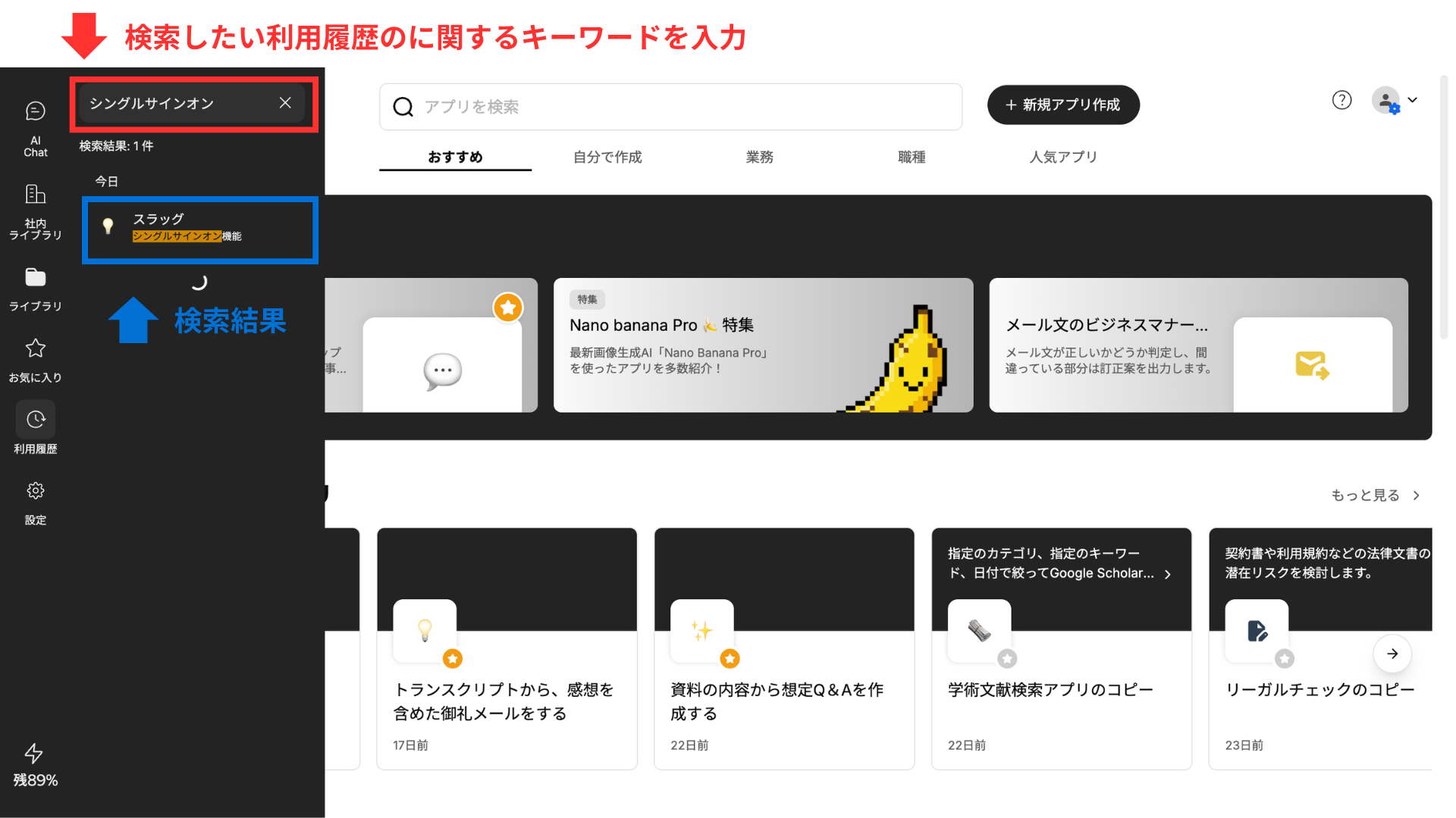 検索ボックスが表示され、ソートしたい履歴に関するキーワードを入力することで、任意の利用履歴を検索することができます。