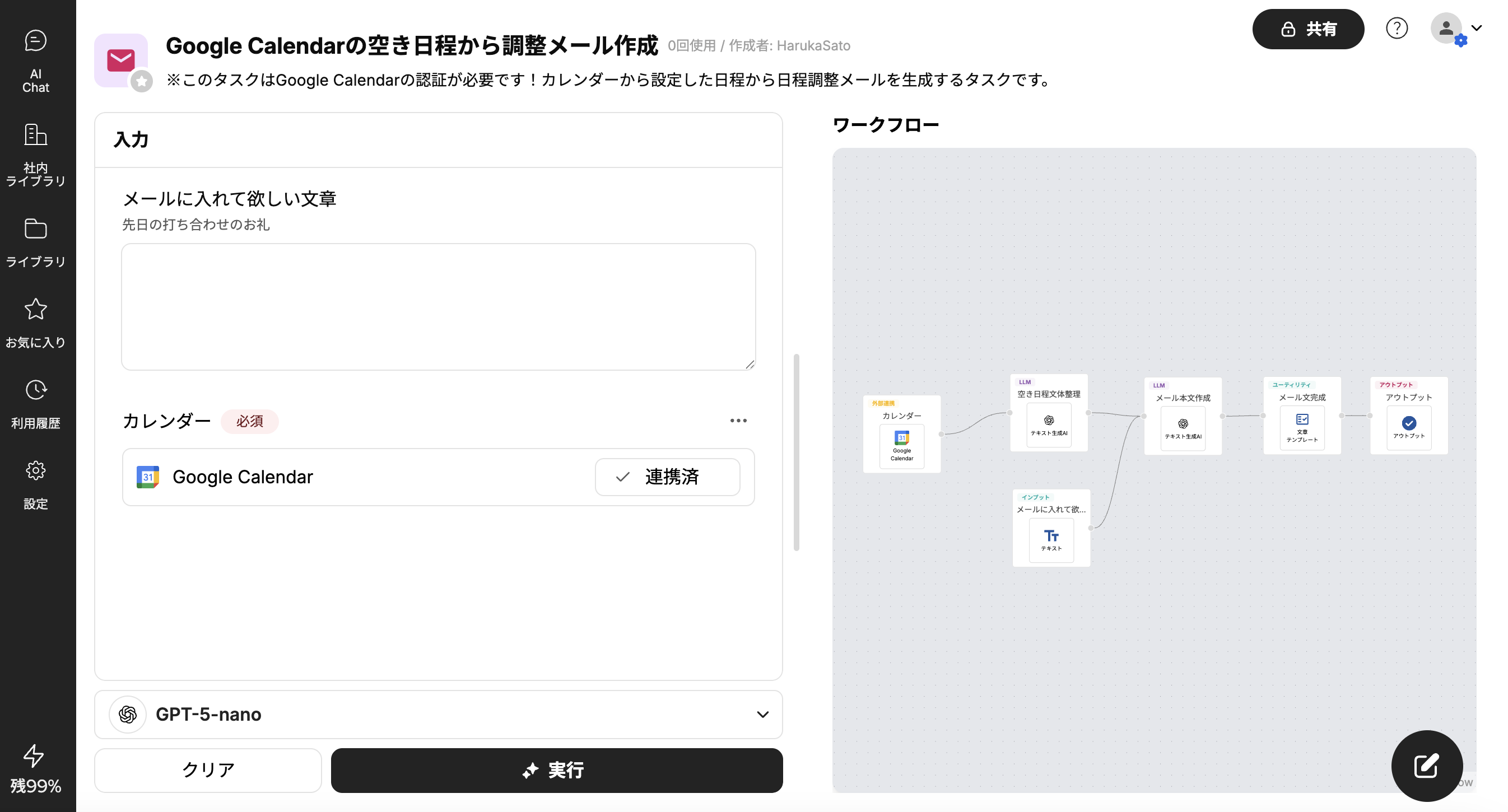 Google Calendarとの連携では、指定されたGoogleカレンダーの空き時間または埋まっている時間を取得することができます。ユーザーは、カレンダーの所有者、期間(例:この先60日間)、時間帯(例:朝7時〜21時)などを指定して、必要な情報を柔軟に取得できます。