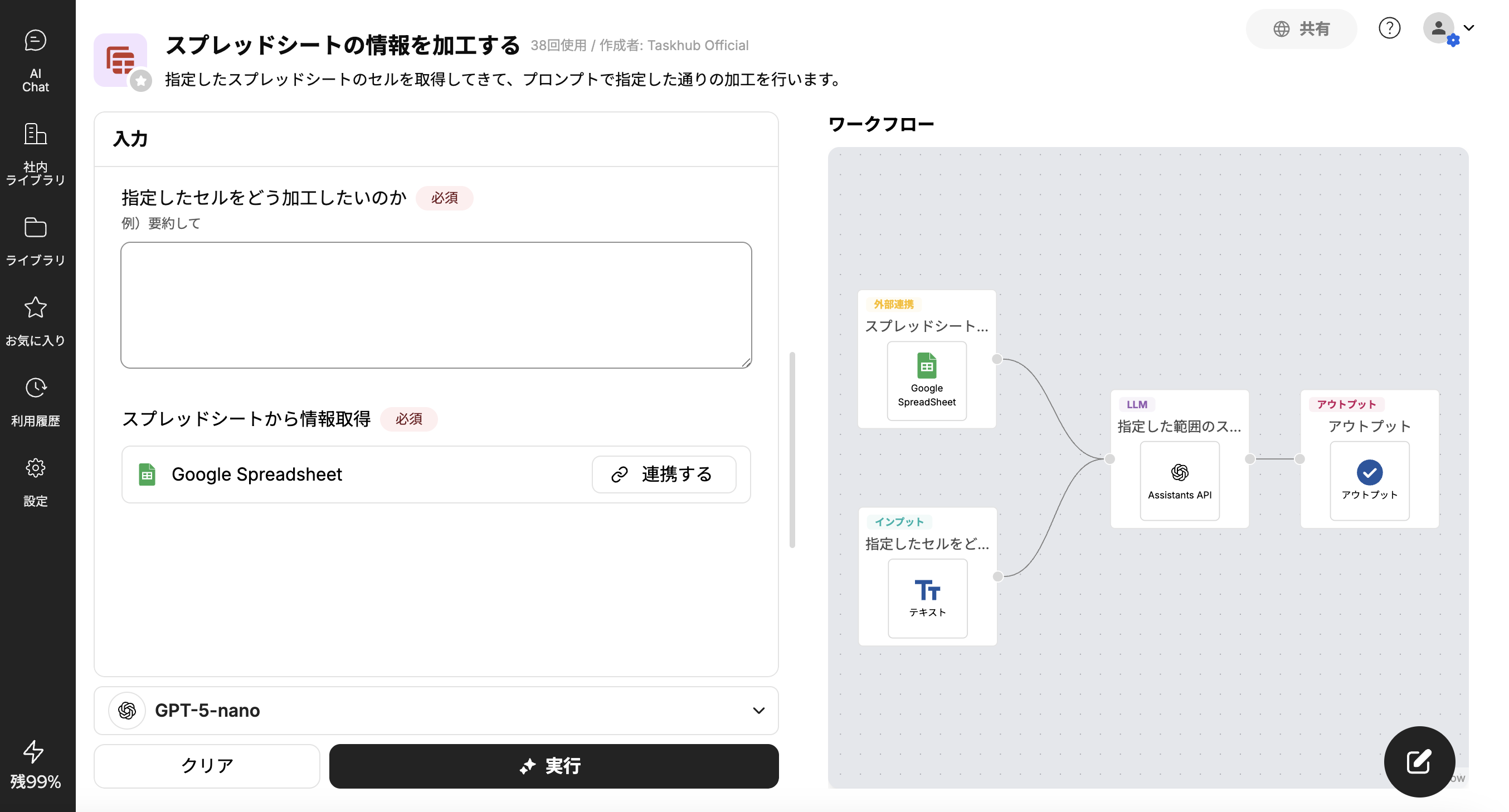 Google SpreadSheetとの連携により、スプレッドシートの内容を最大5000セル分取得することが可能です。ユーザーは実行時に、どのシートのどのセル範囲から情報を取得するかを指定できます。