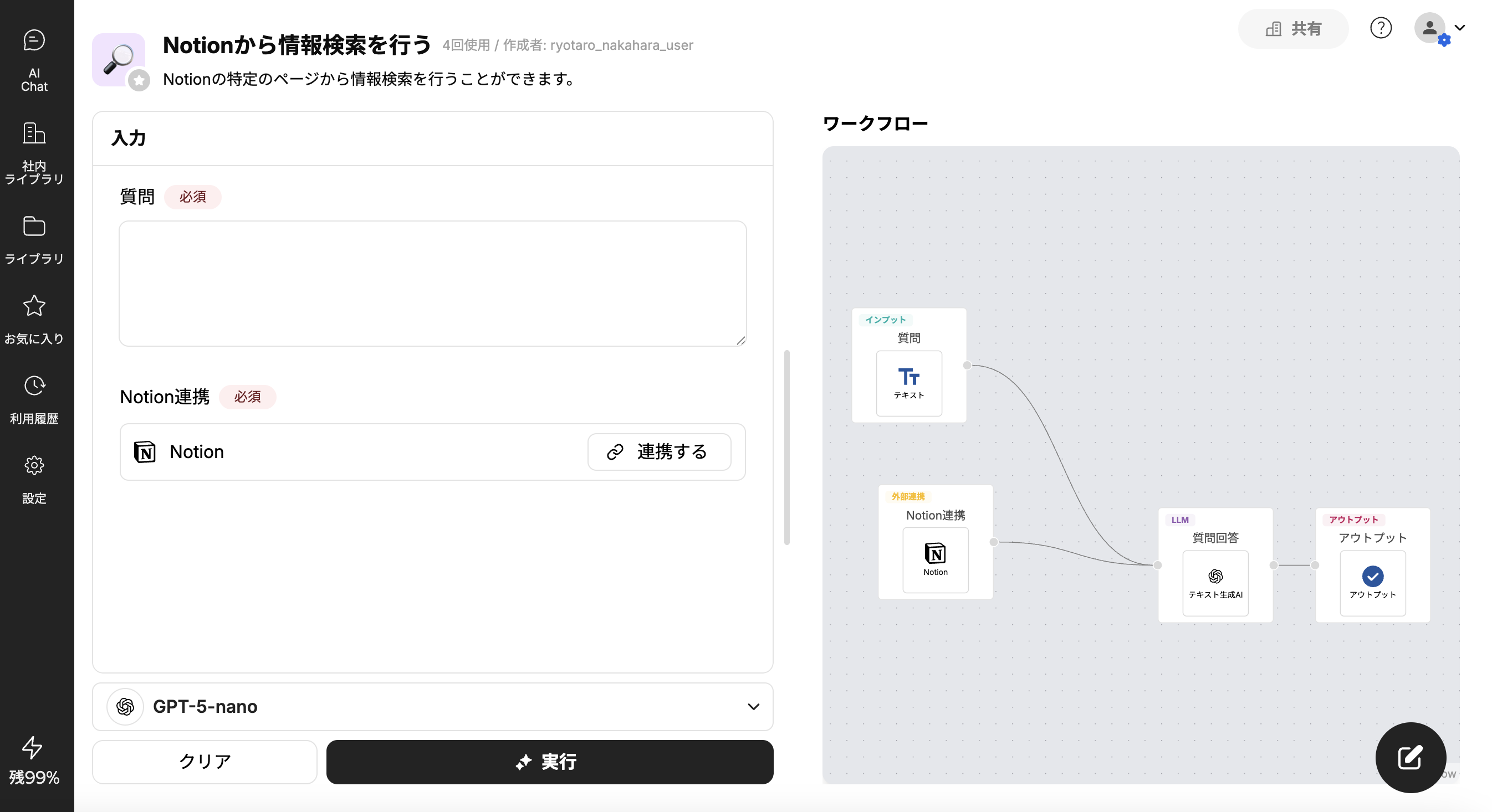 Notionとの連携では、指定されたNotionページの内容を取得することができます。これにより、Notionで管理されている情報をワークフローに統合することが可能になります。