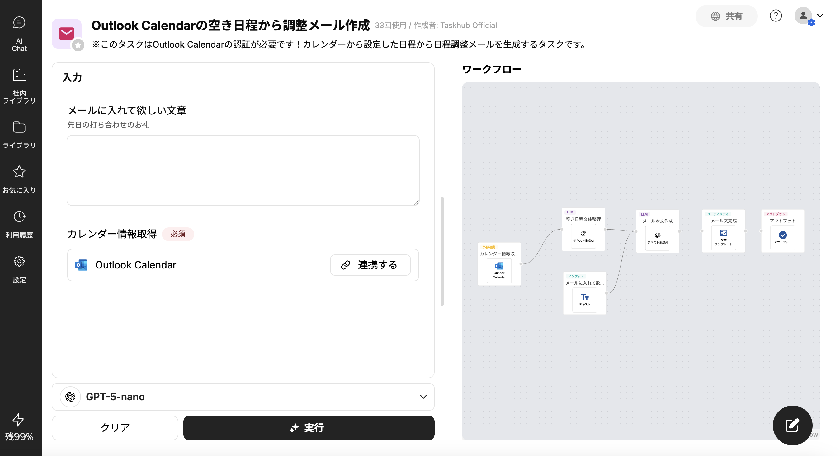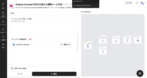 Outlook Calendarとの連携は、Google Calendarと同様に、指定されたOutlookカレンダーの空き時間または埋まっている時間を取得することができます。ユーザーは、カレンダーの所有者、期間(例:この先60日間)、時間帯(例:朝7時〜21時)などを指定して、必要な情報を柔軟に取得できます。