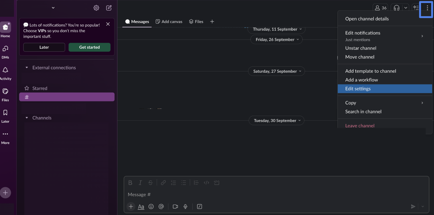 チャンネル画面の右上にある3つのドット(︙)のアイコンをクリックし、表示されたメニューから“Edit Settings”を選択します。
