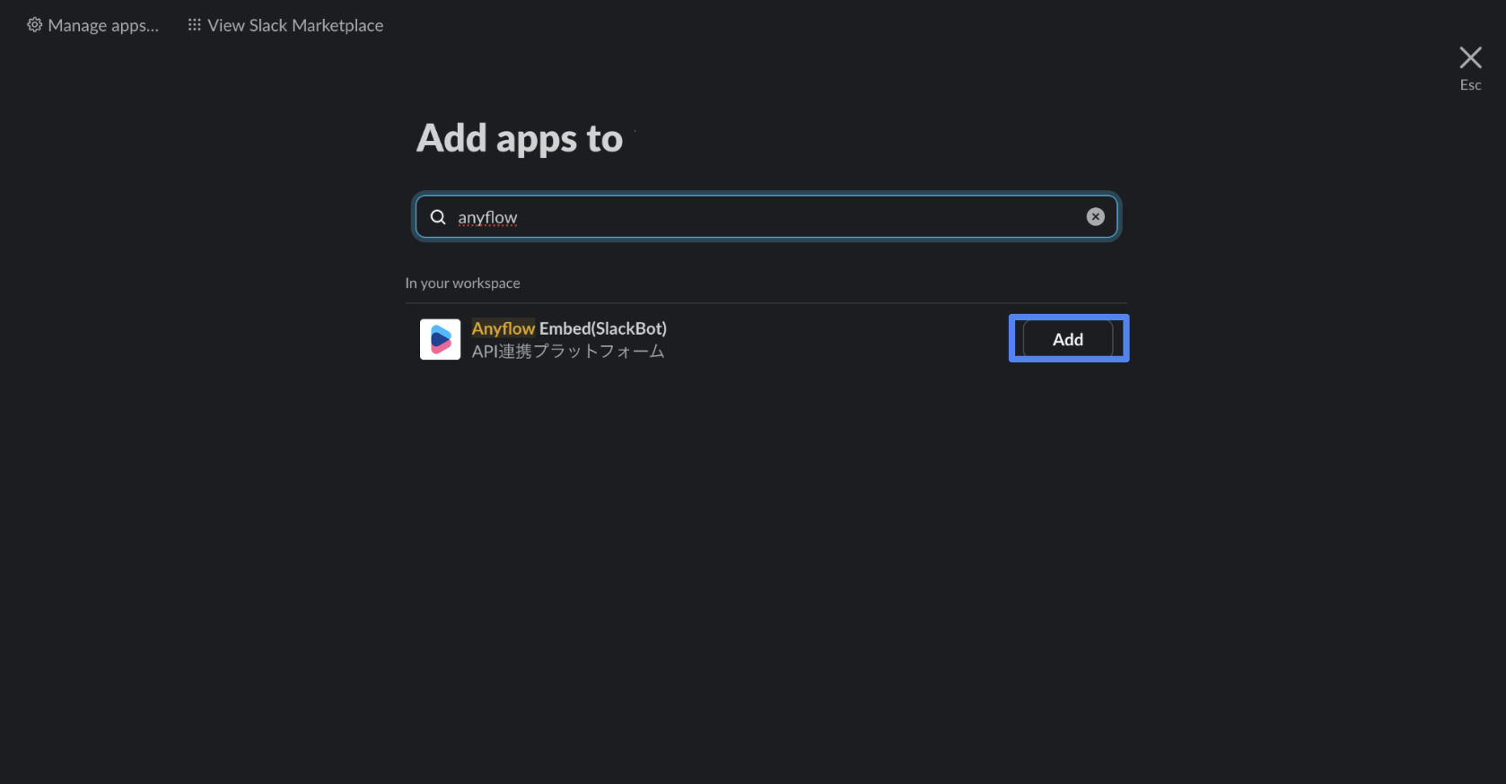 アプリの検索バーが表示されたら、”Anyflow”と入力します。検索結果にAnyflowアプリが表示されたら、その横にある“Add”ボタンをクリックします。