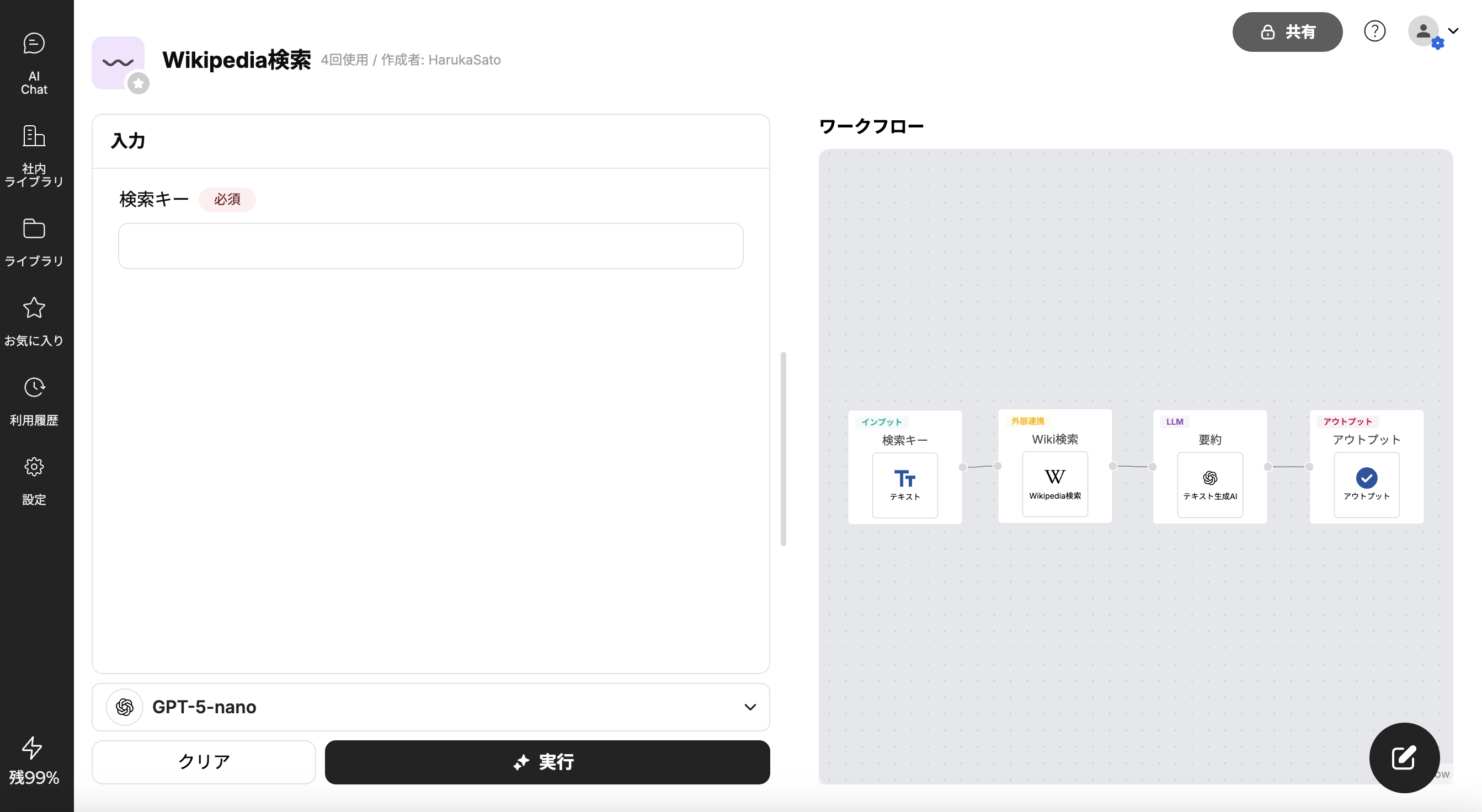 Wikipedia検索との連携では、入力されたテキストに基づいてWikipediaで検索を行い、上位ページのURLとメタディスクリプションを出力します。