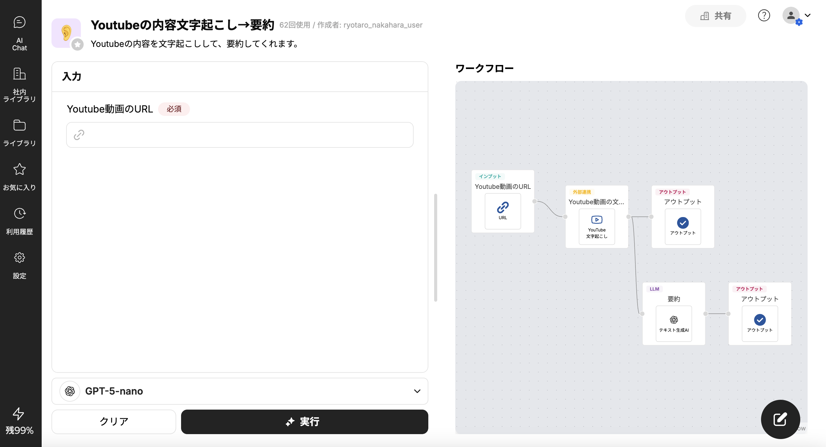 YouTube文字起こし機能は、URLノードに入力されたYouTube動画のURLから、動画の内容を文字起こししたテキストを出力します。これにより、動画コンテンツをテキストベースのワークフローに統合することができます。