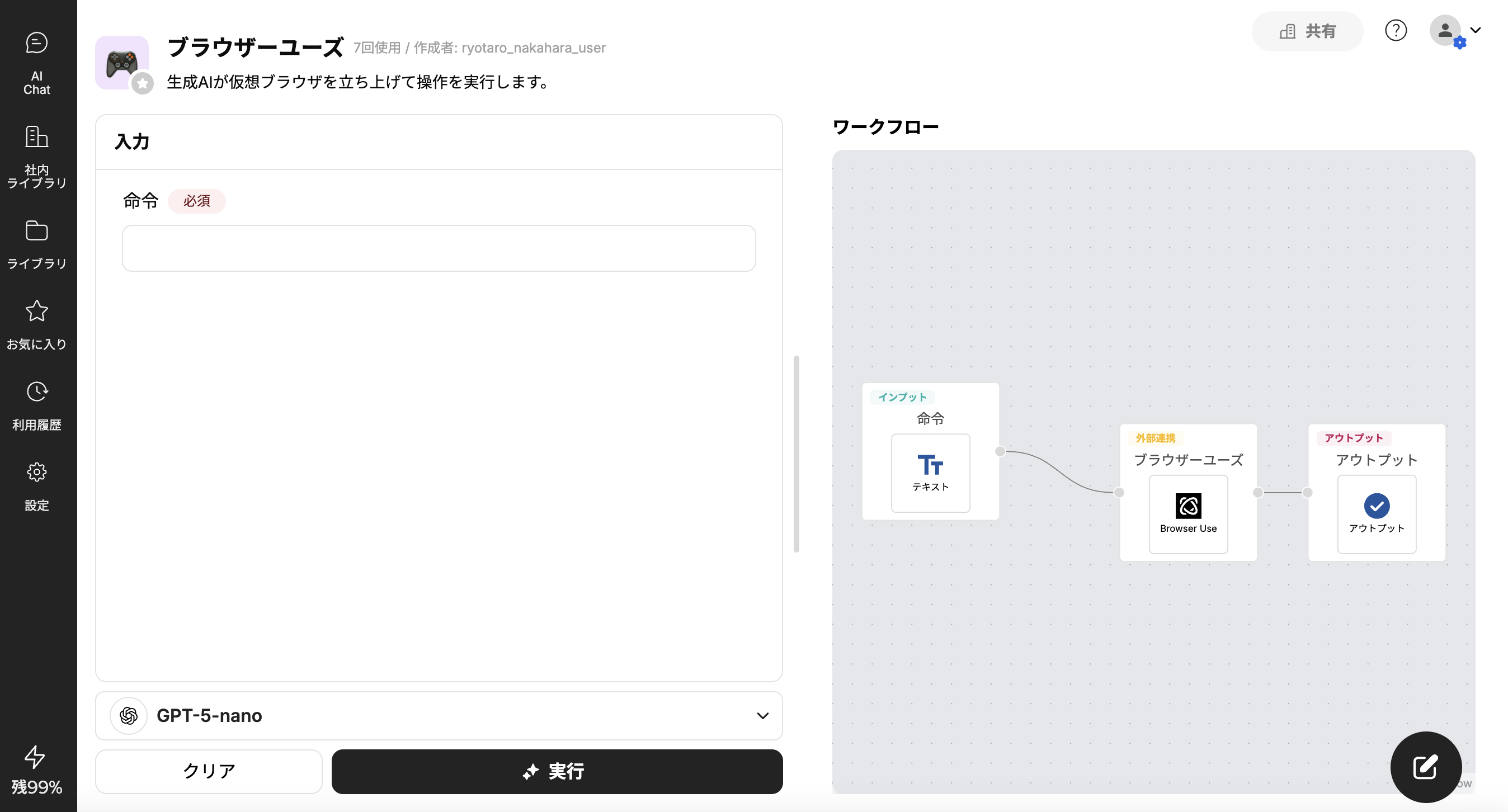 BrowserUseノードは、ウェブブラウザを自動的に操作して様々なタスクを実行する機能を提供します。テキストノードに操作の命令を入力することで、ブラウザを自動制御し、その操作過程を視覚的に確認できるURLを出力します。ただし、AIの技術的な限界により、動作に時間がかかる場合があります。