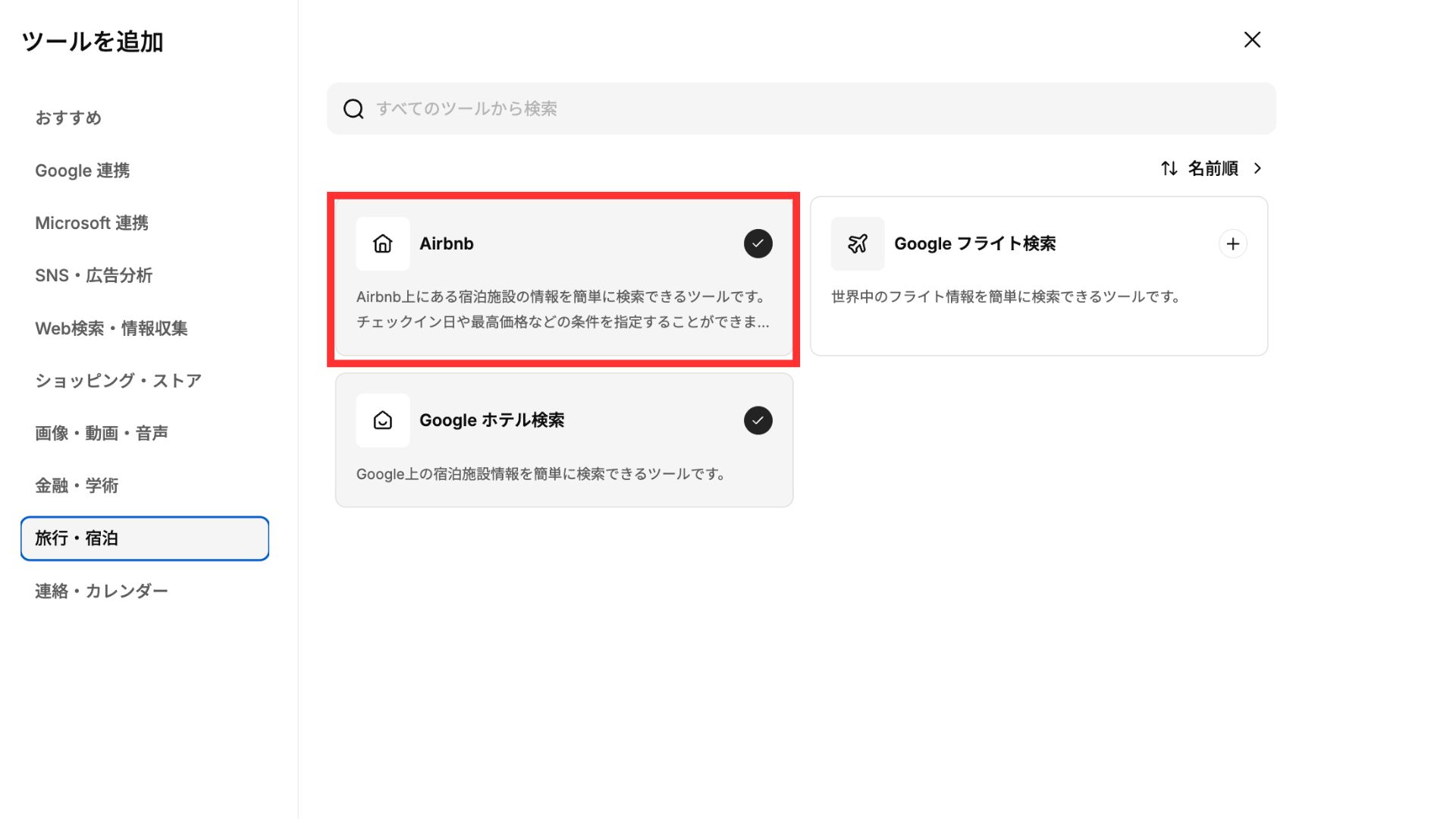 エージェントアプリ作成画面から、「ツールを追加」をクリックするとAirbnbツールを追加できます。