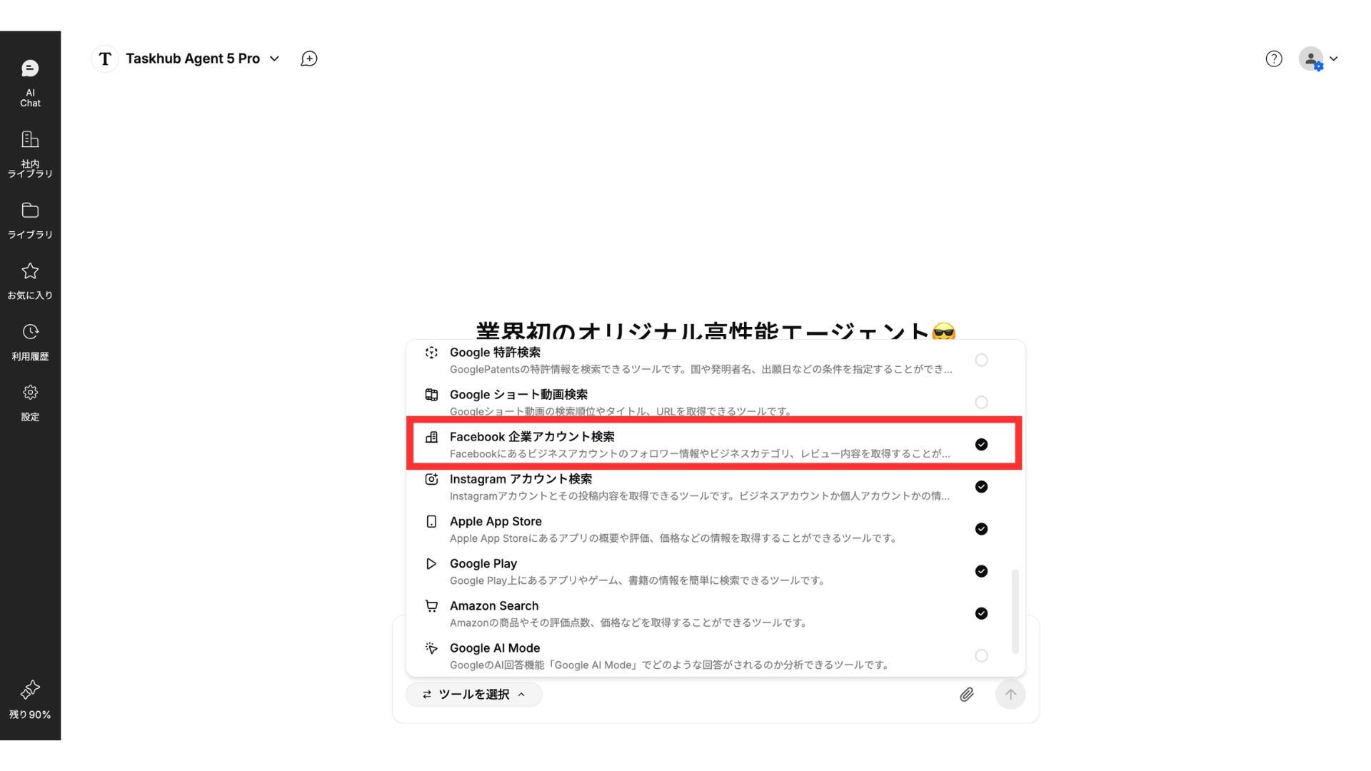 AIチャット画面でモデルを「Taskhub Agent」に設定し、「ツールを選択」からFacebook企業アカウント検索にチェックを入れます。