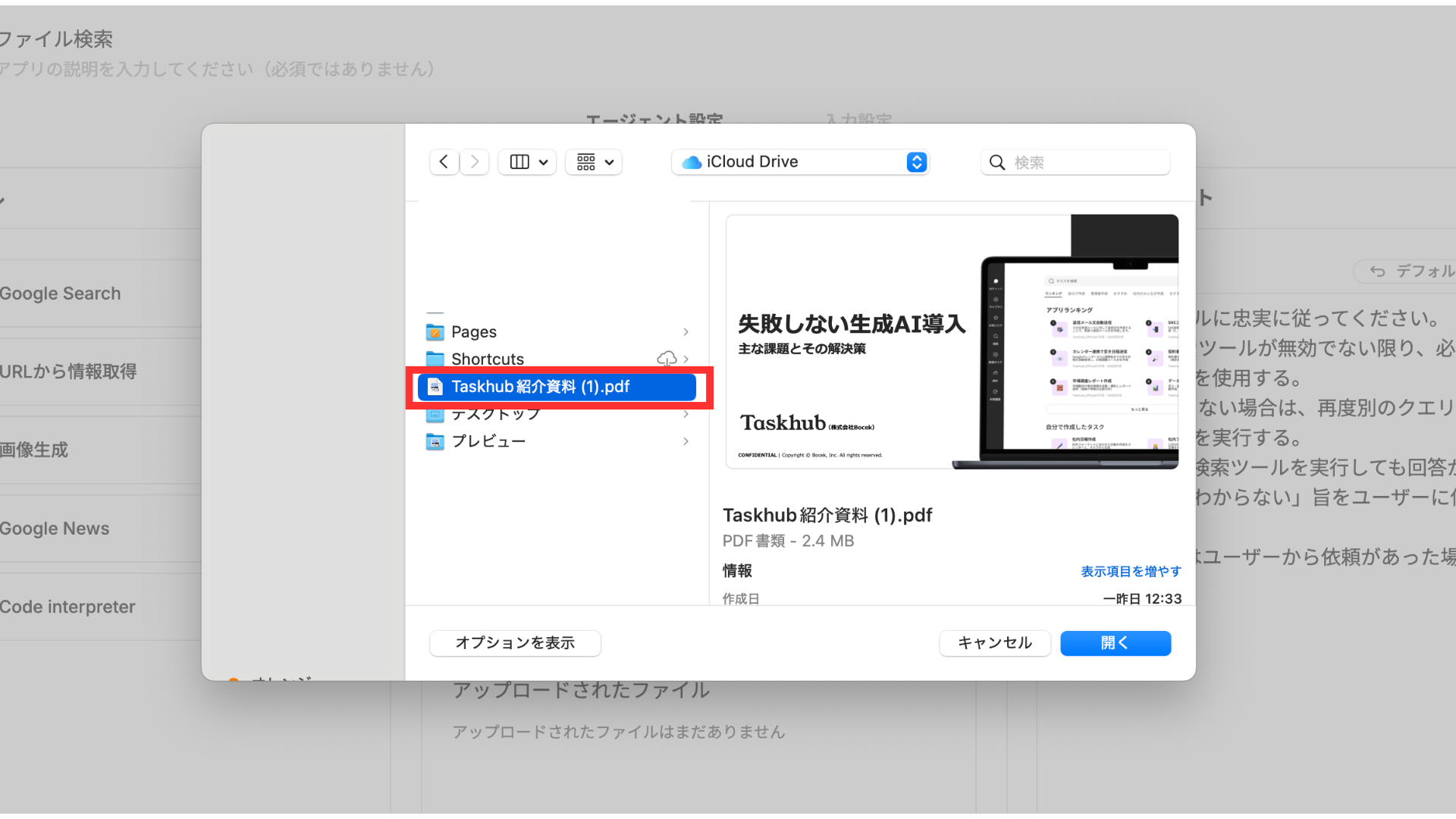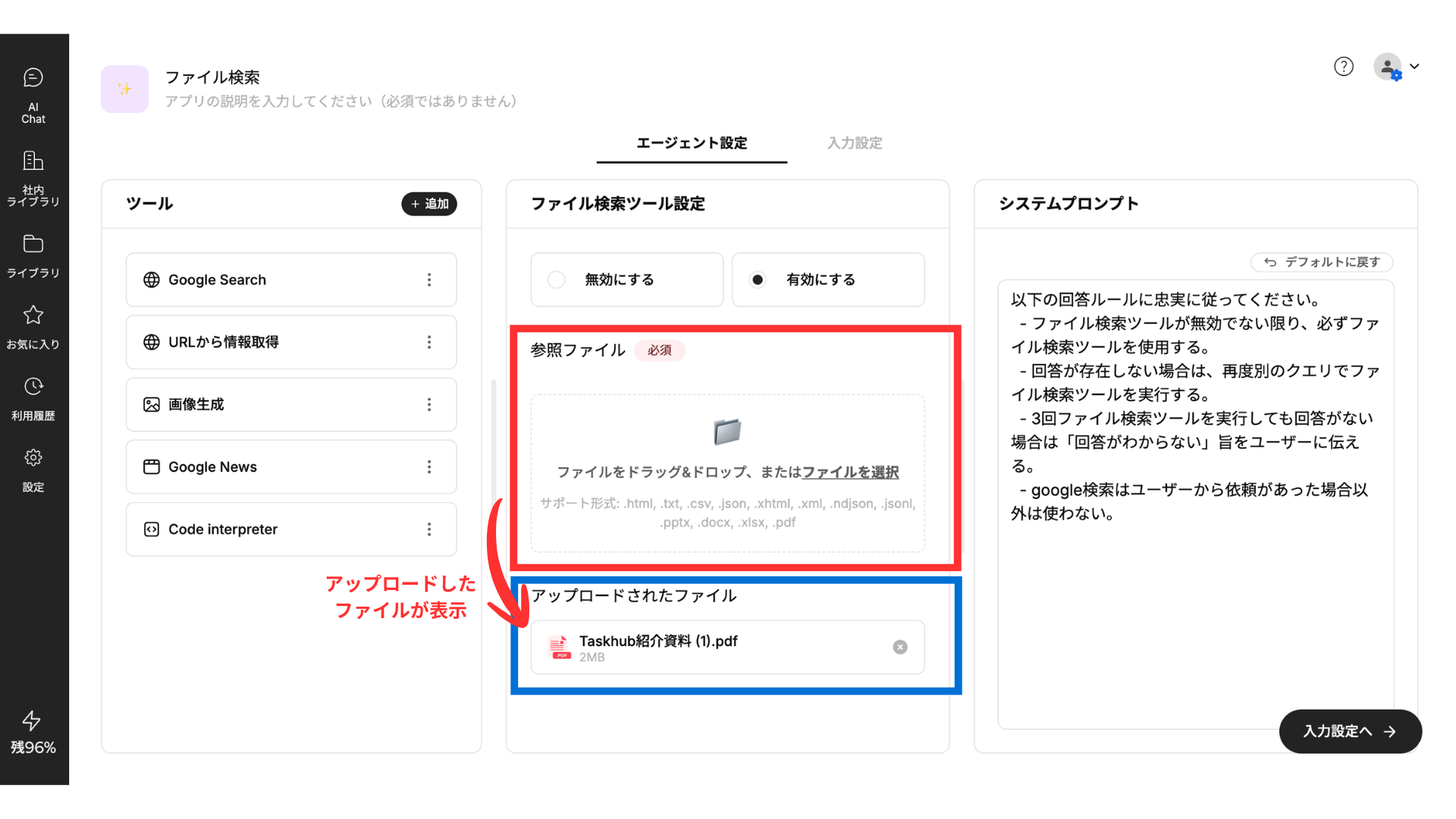 この状態でエージェントアプリを作成することで、アップロードしたファイルを参照してタスクを行うアプリが作成できます。