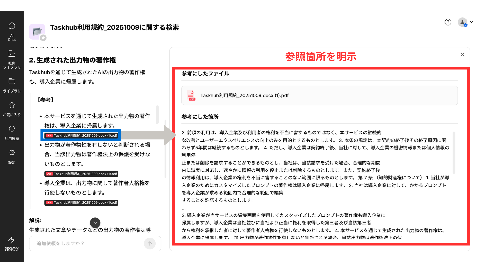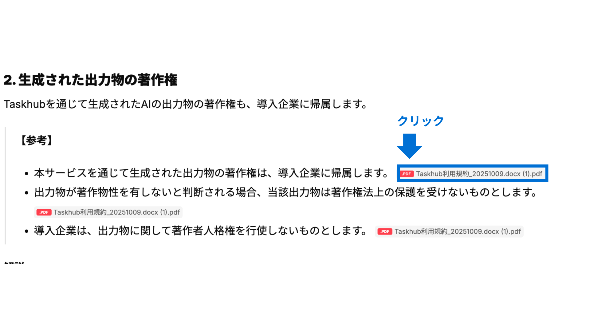 AIがアップロードしたファイルを元に回答を行った場合、ファイルのどの部分を参照したのかを文末に明記します。