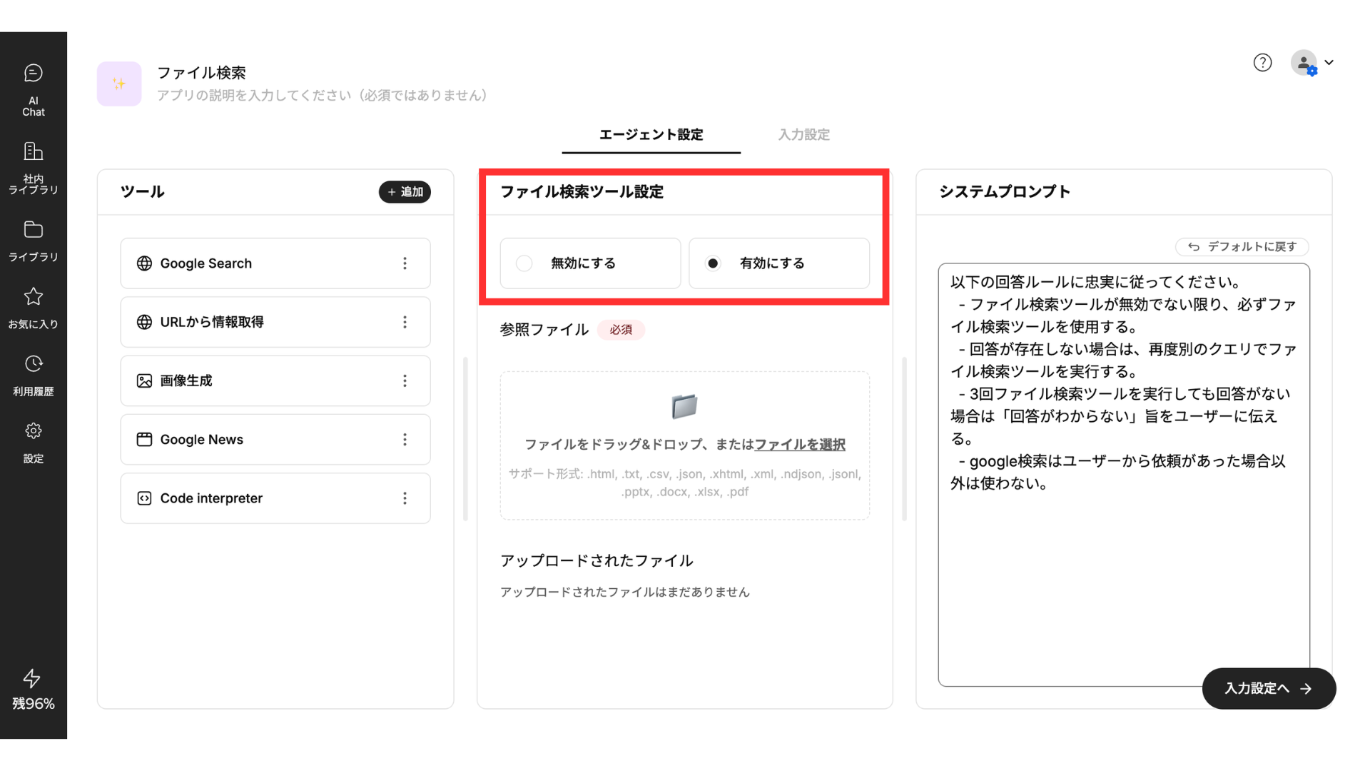 エージェントアプリの作成・編集画面を開き、エージェント設定から「ファイル検索ツール設定」を有効にします。