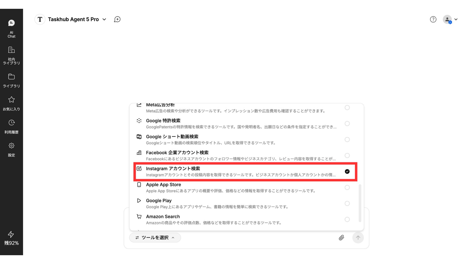 AIチャット画面でモデルを「Taskhub Agent」に設定し、「ツールを選択」からInstagramアカウント検索にチェックを入れます。