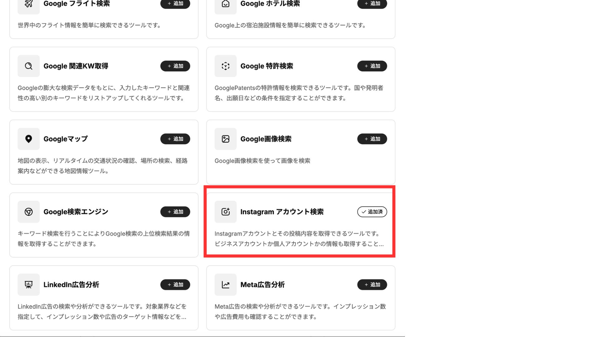 エージェントアプリ作成画面から、「ツールを追加」をクリックするとInstagramアカウント検索を追加できます。