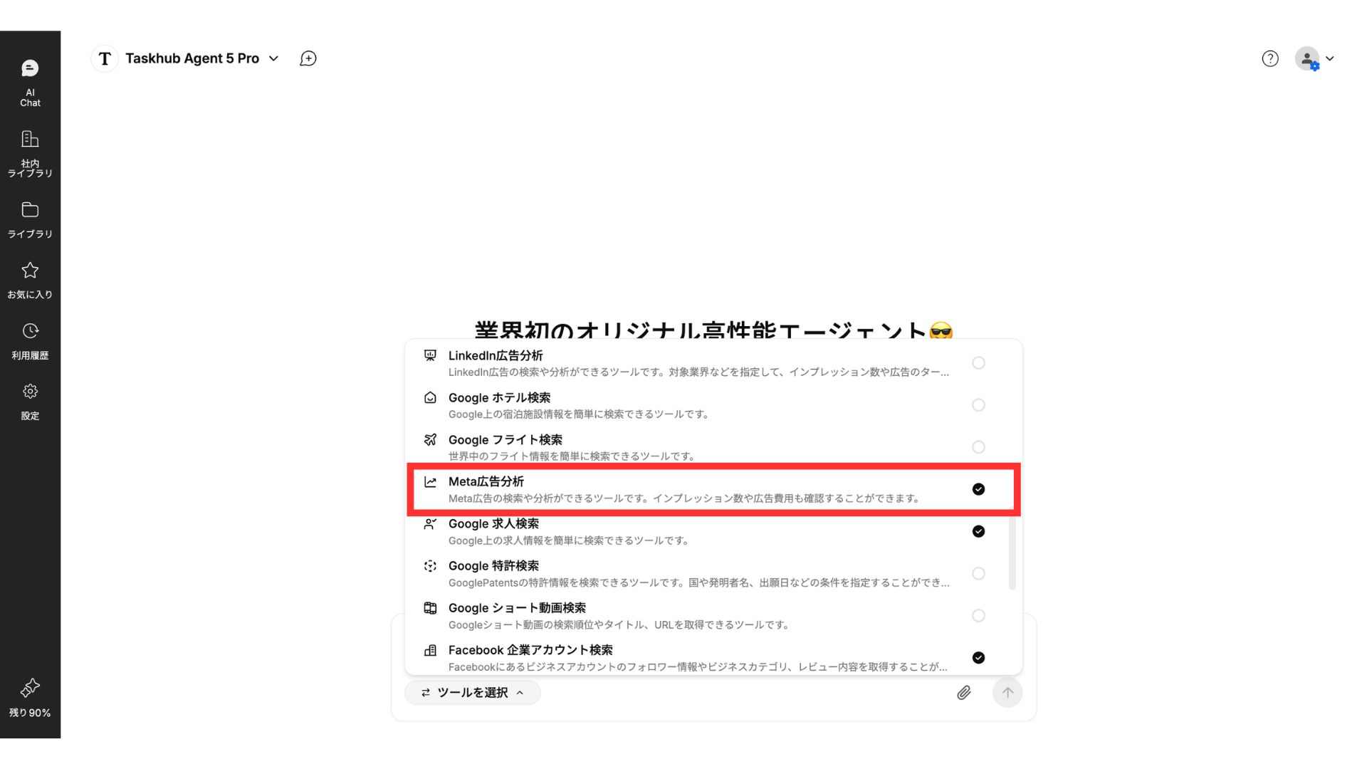 AIチャット画面でモデルを「Taskhub Agent」に設定し、「ツールを選択」からMeta広告分析にチェックを入れます。