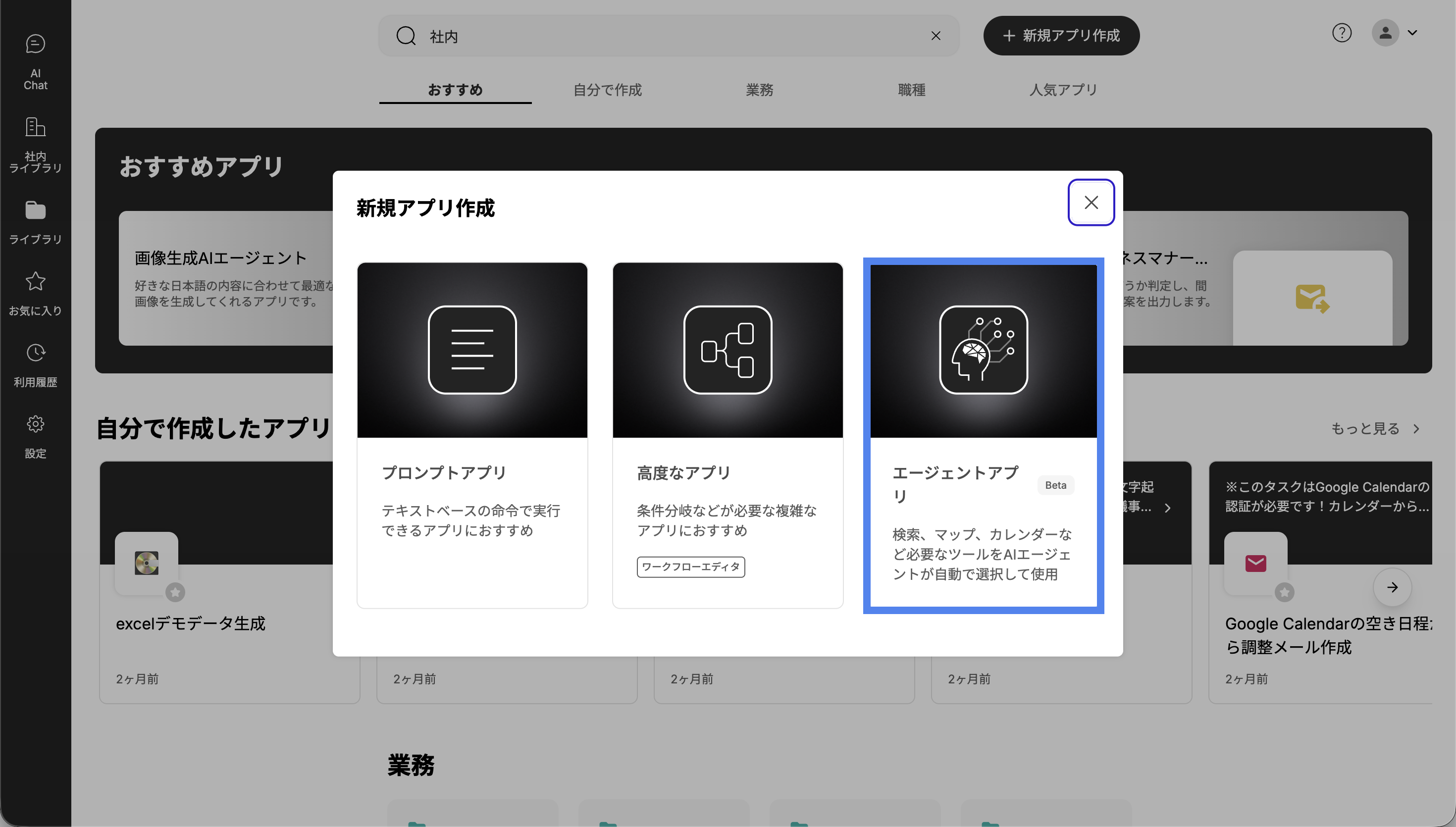 プロンプトアプリの作成を開始するには、まず「ライブラリ」や「お気に入り」画面の右上にある「新規アプリ作成」ボタンをクリックします。クリックすると、アプリの種類を選択する画面が表示されます。ここで右側の「エージェントアプリ」を選択してください。