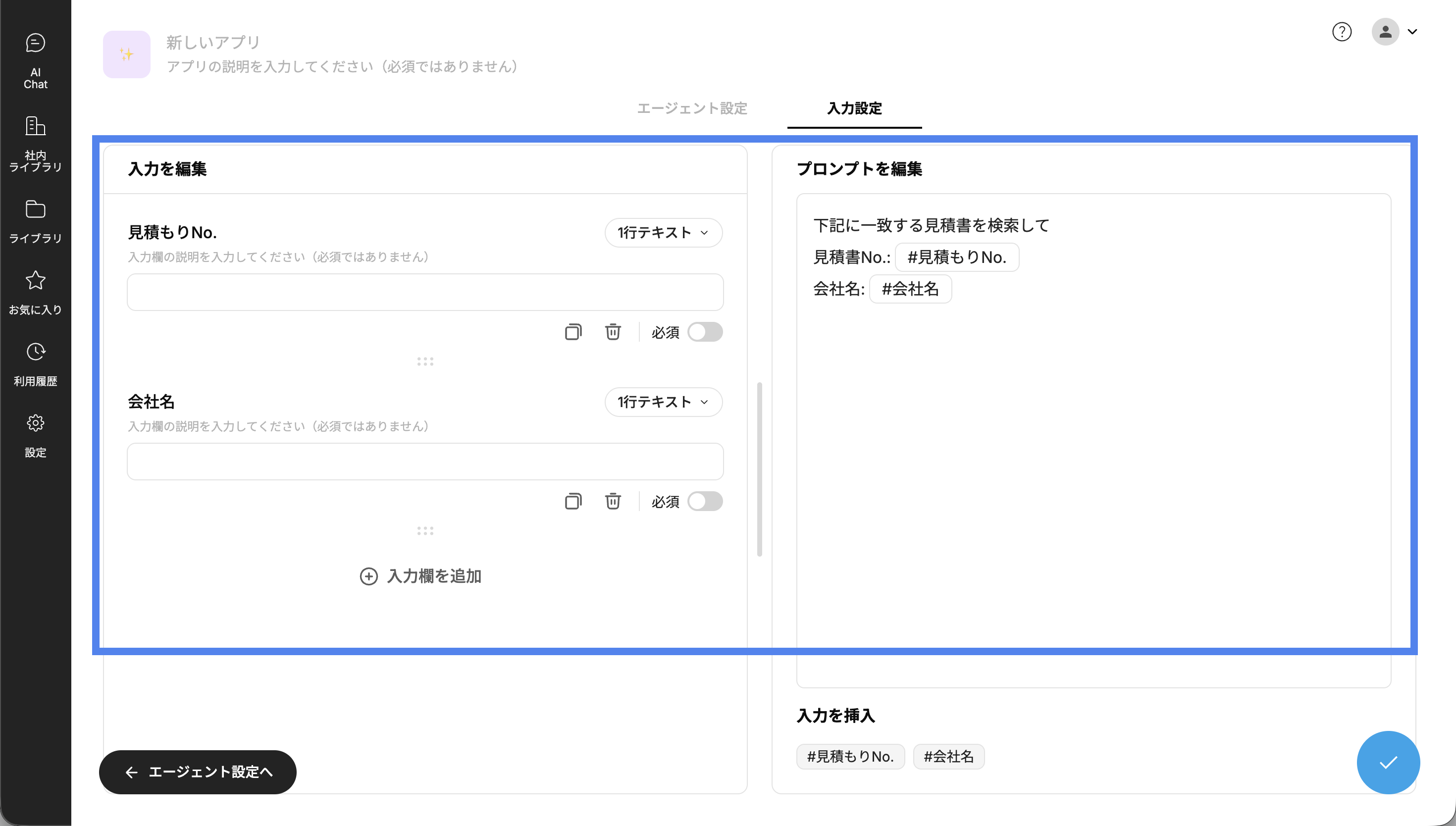 こちらはプロンプトアプリと同様に、入力項目と、それに対応したプロンプトの作成で完了します。詳しくはこちらをご覧ください。