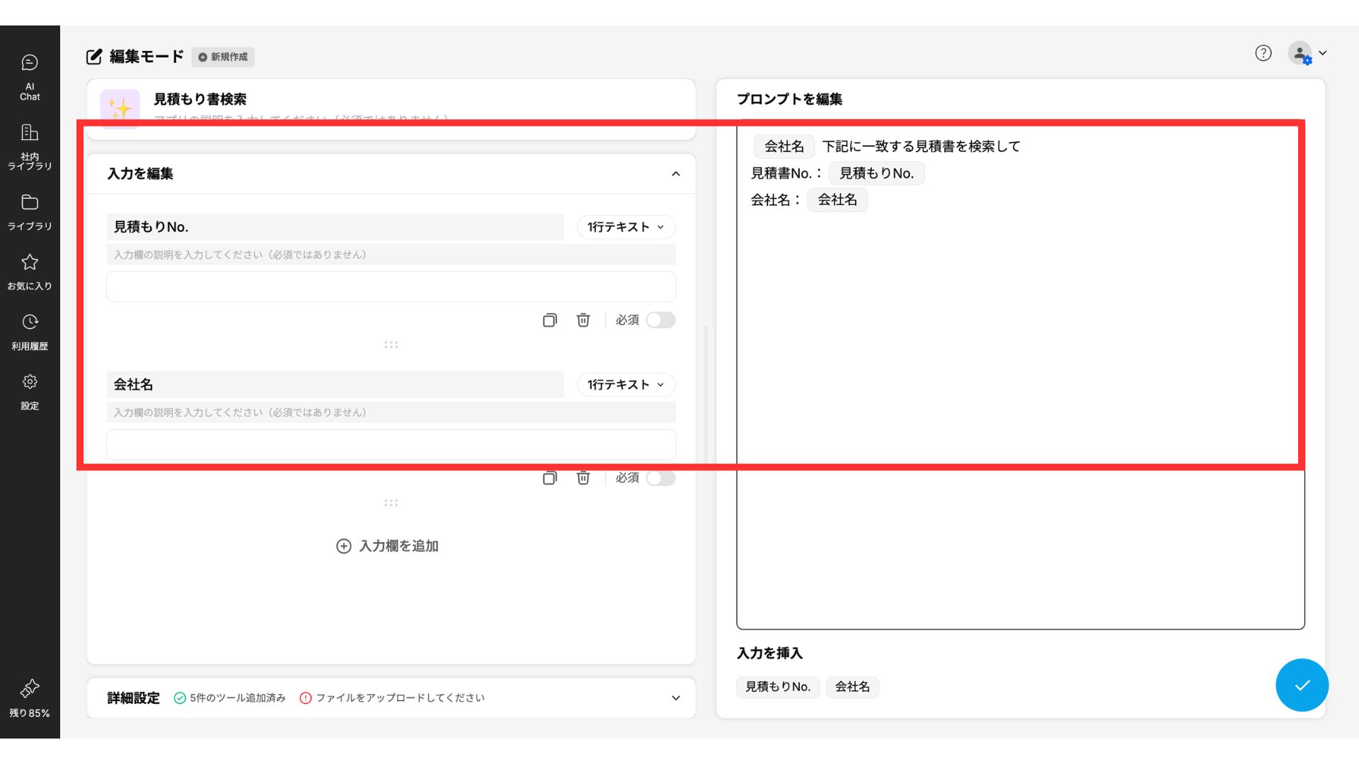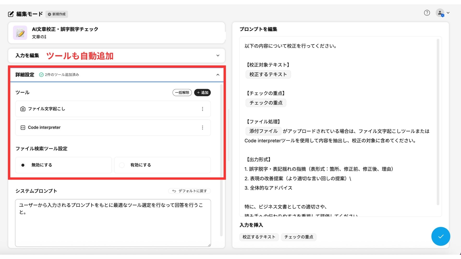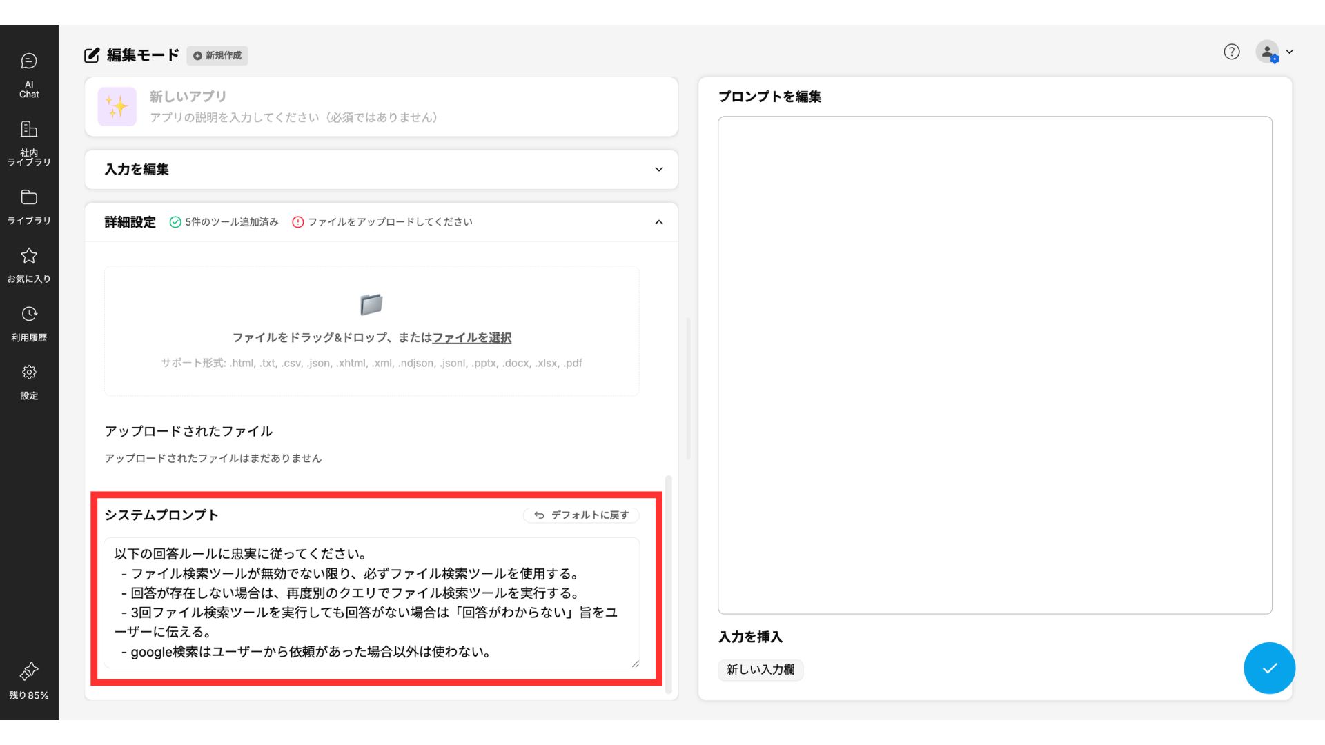 デフォルトでは、ファイル検索に最適なシステムプロンプトになっているので、必要に応じて編集してください。