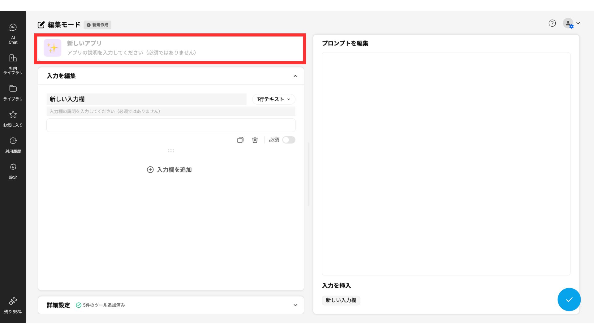 入力フォームは30個まで作成をすることができます。こちらはプロンプトアプリと同様に、入力項目と、それに対応したプロンプトの作成で完了します。詳しくはこちらをご覧ください。