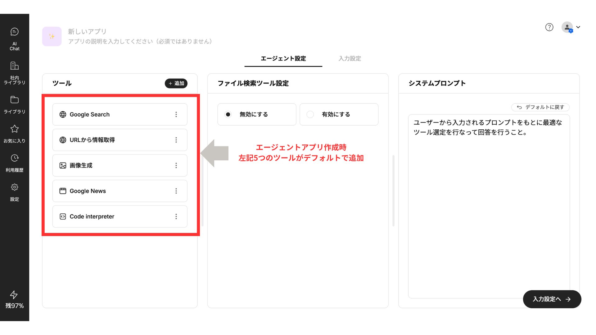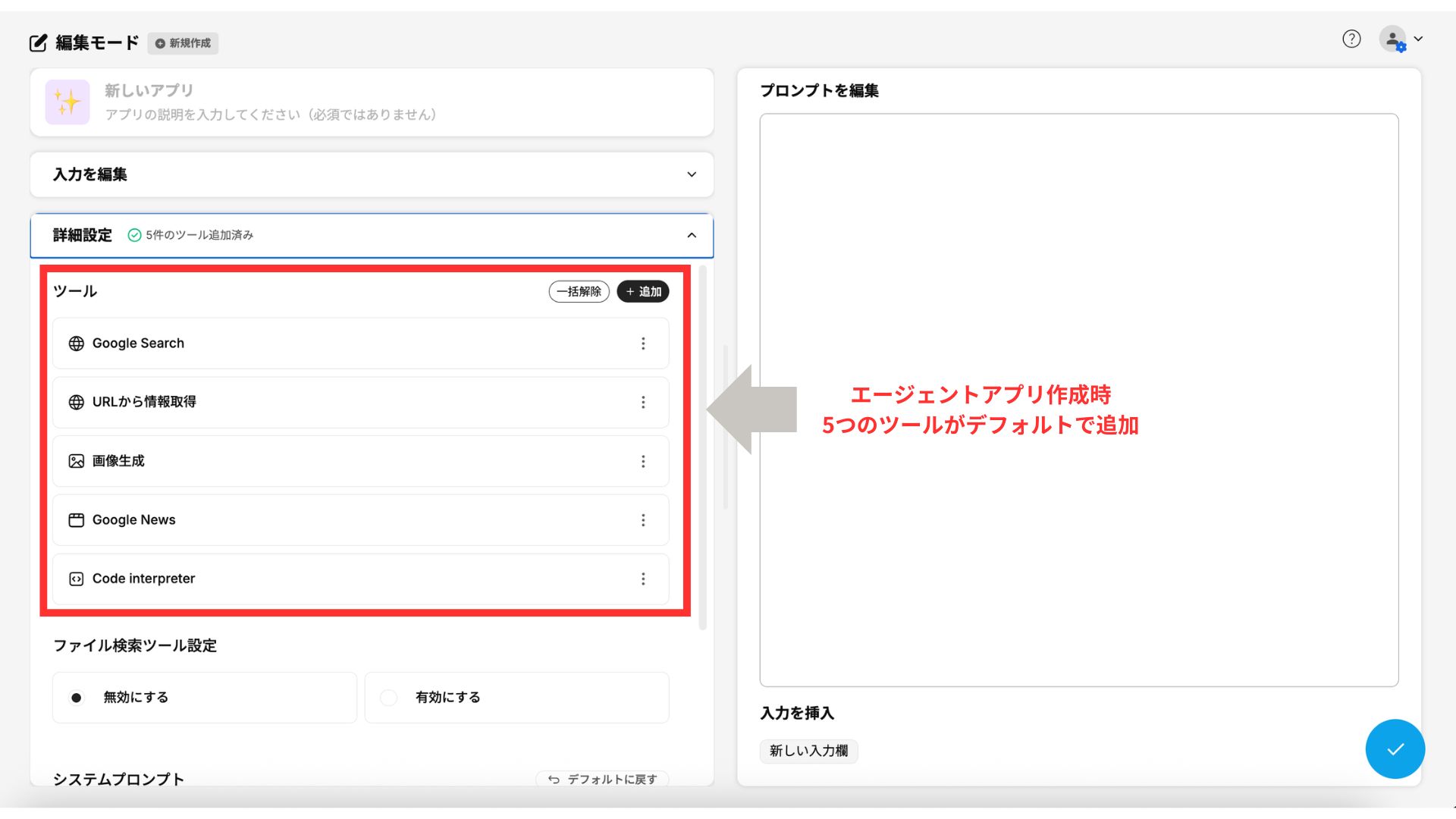 エージェントアプリの新規作成時、「Google Search」「URLから情報取得」「画像生成」「Google News」「Code Interpreter」の5つのツールが、デフォルトで追加されるようになりました。