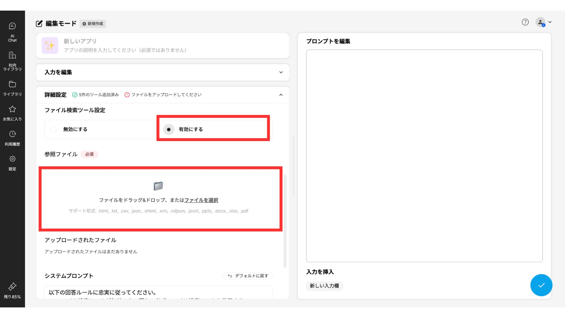 ファイル検索(RAG)を用いる場合には、ファイル検索ツール設定を「有効にする」にして、AIに検索させたいファイルをドラッグ&ドロップでアップロードしてください。