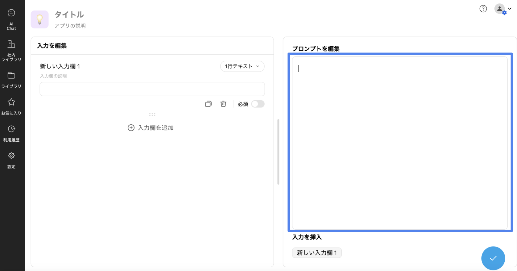 画面右側のテキストボックスにプロンプトのテンプレートを入力します。これがアプリの中核となる指示や質問になります。