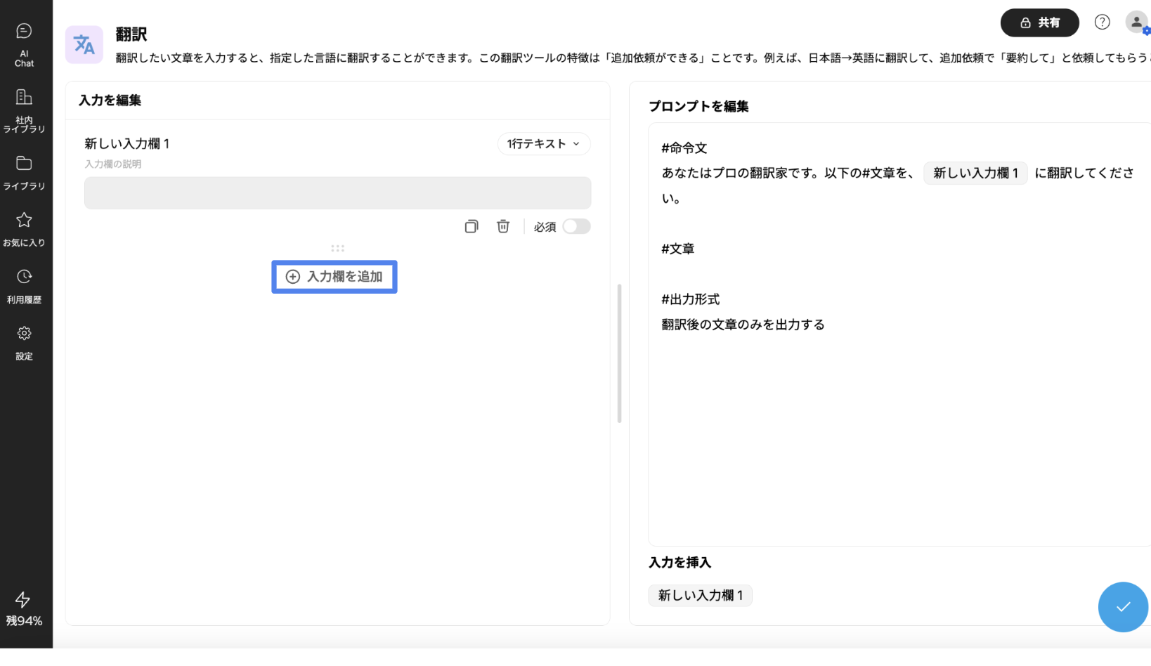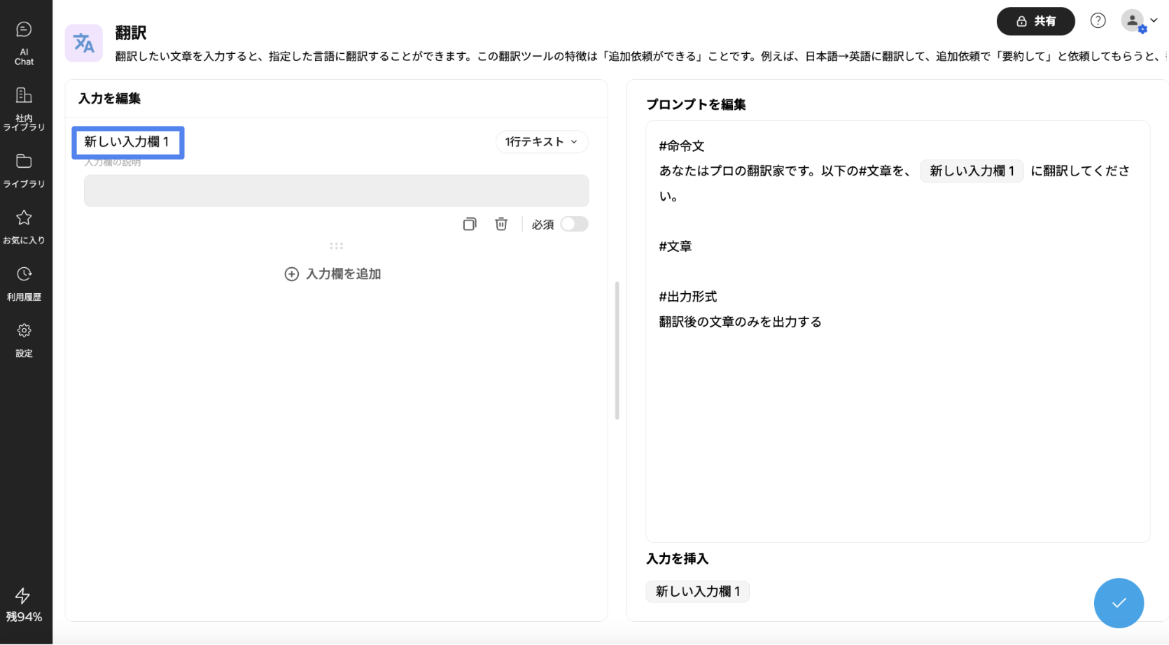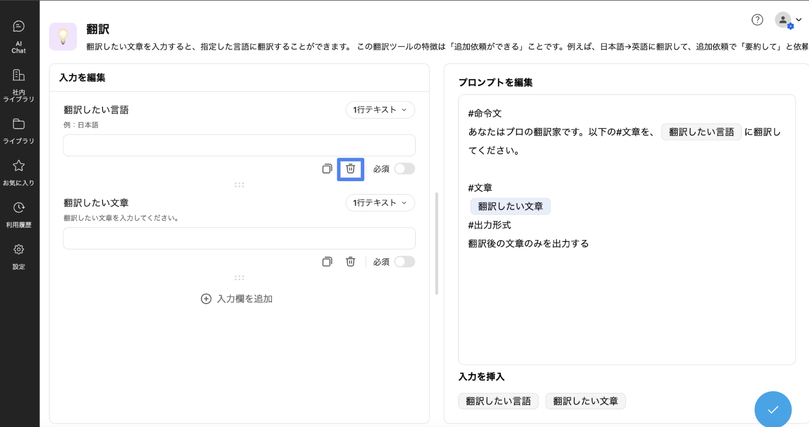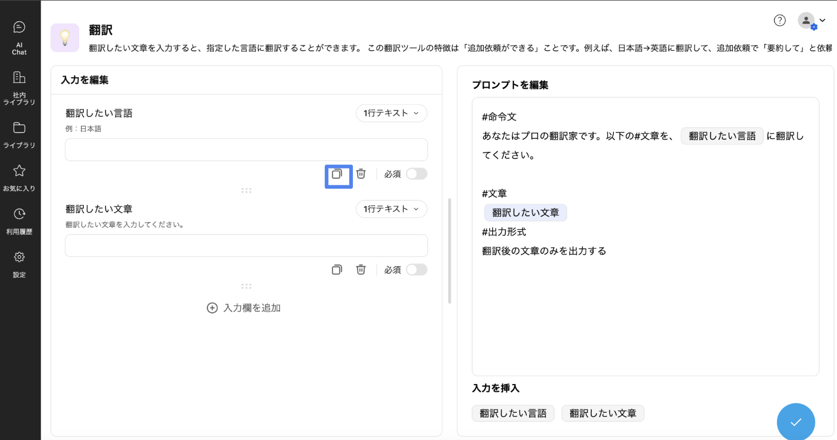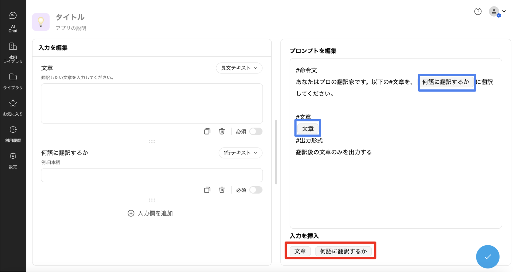 テンプレート内で変数として使用したい部分がある場合は、「入力を挿入」機能を使用します。画面右下にある「入力を挿入」から適切な変数タイプを選択し、クリックして挿入します。これにより、アプリ使用時にユーザーが特定の情報を入力できるようになります。変数は画面左側から設定可能です。