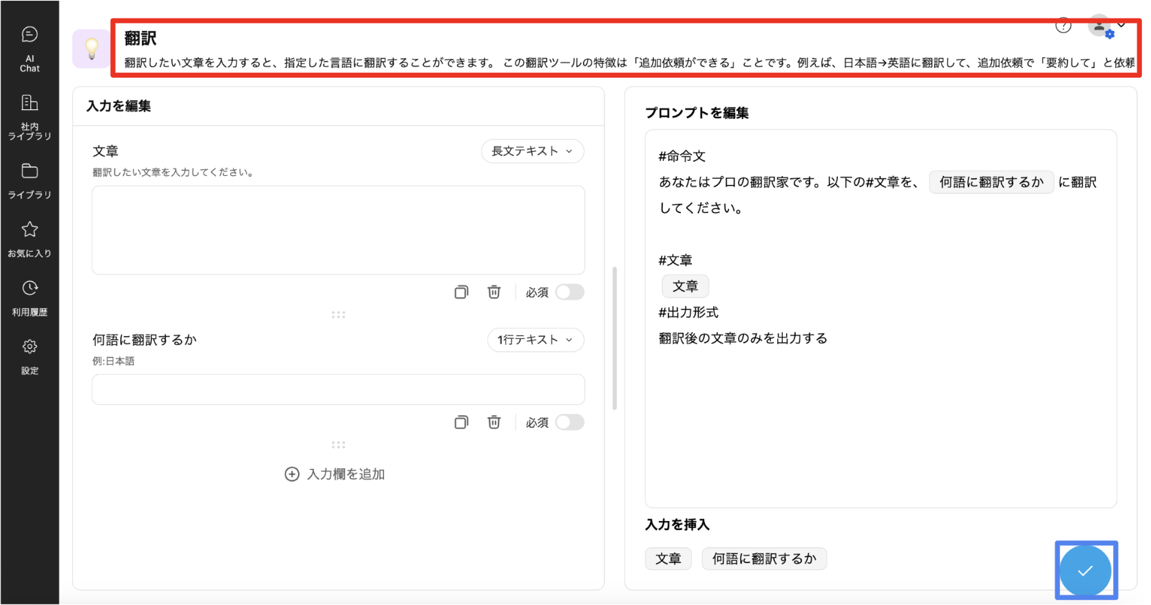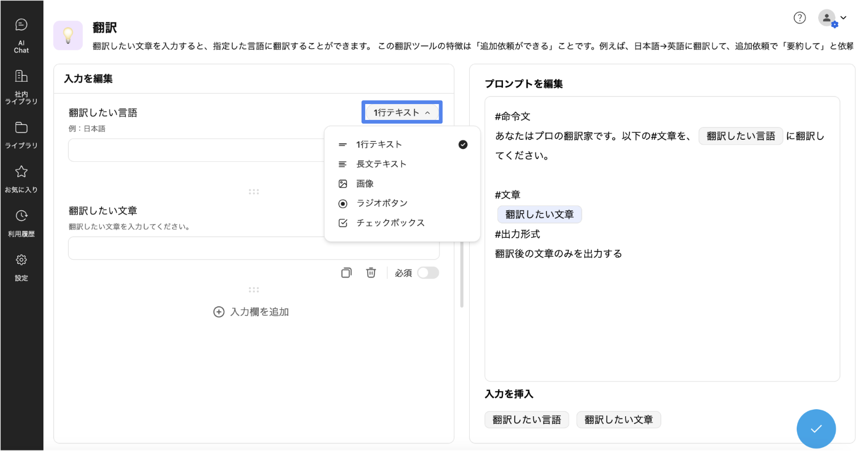 プロンプトアプリの柔軟性と使いやすさを高める重要な要素の一つが、多様な入力形式の活用です。変数の入力形式を変更するには、入力欄の右側にある選択ボタン(青枠)をクリックします。