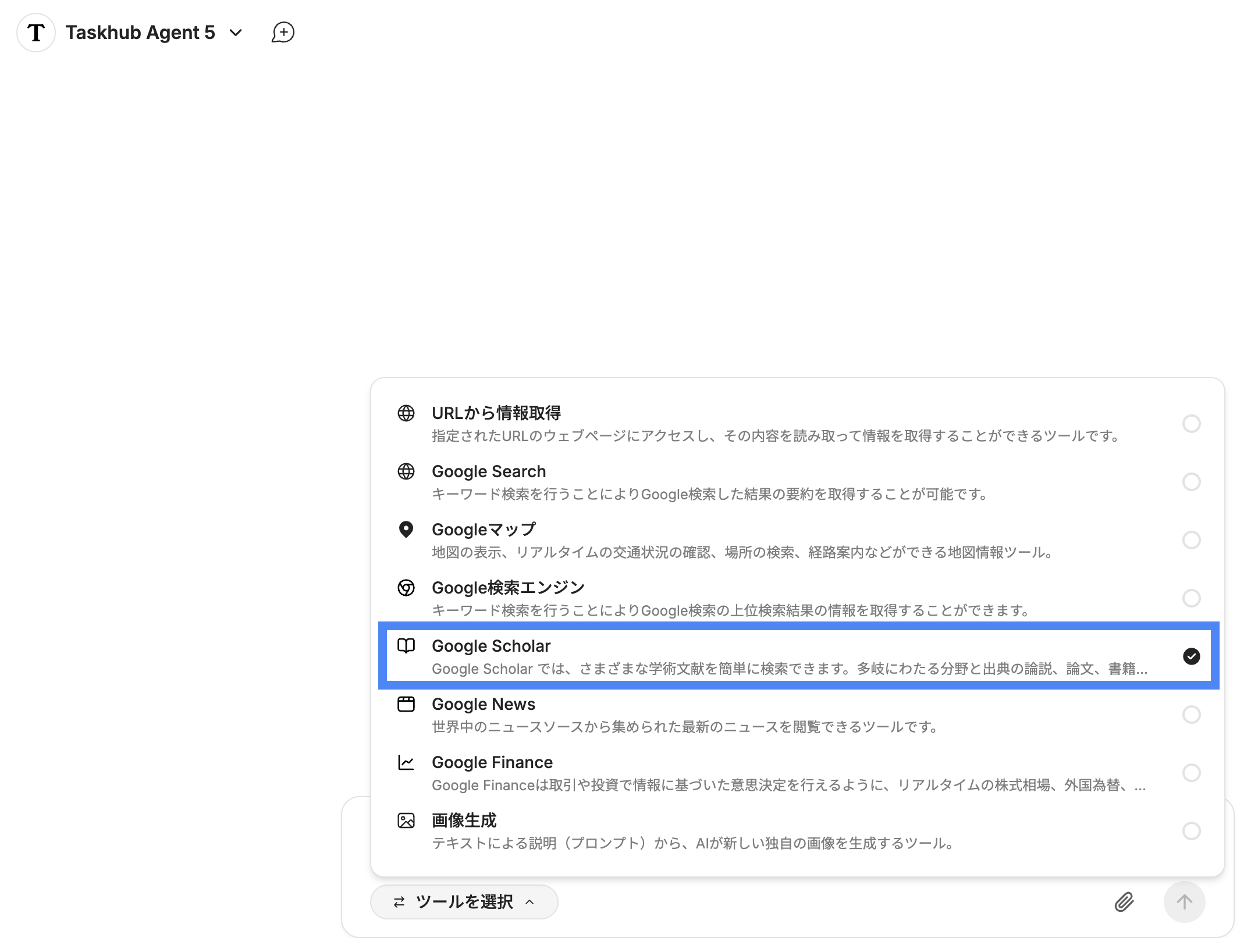 AIチャット画面でモデルを「Taskhub Agent」に設定し、「ツールを選択」からGoogle Scholar ツールにチェックを入れます。
