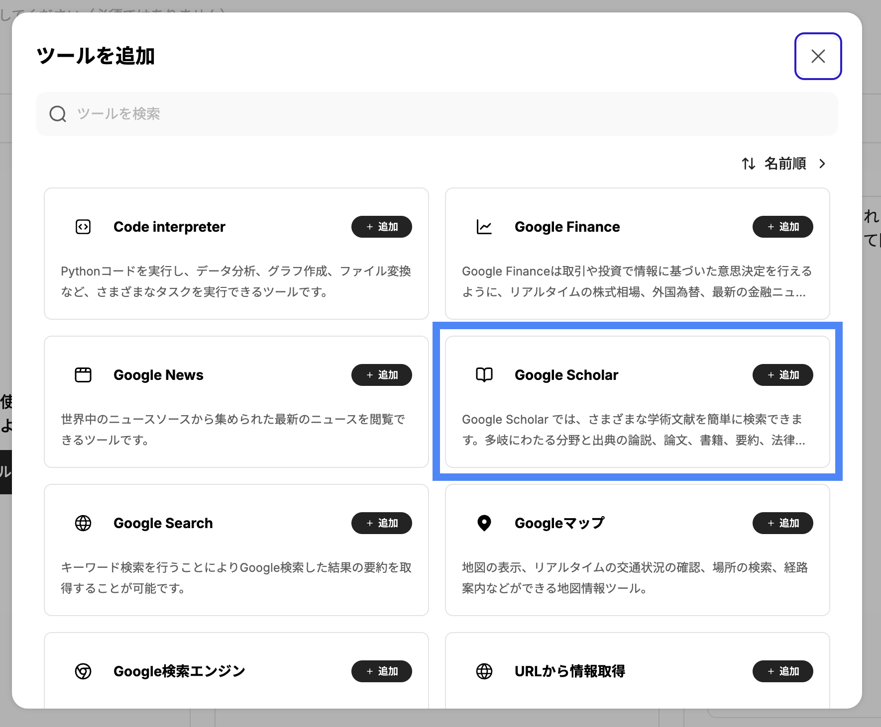 エージェントアプリ作成画面から、「ツールを追加」をクリックするとGoogle Scholar ツールを追加できます。