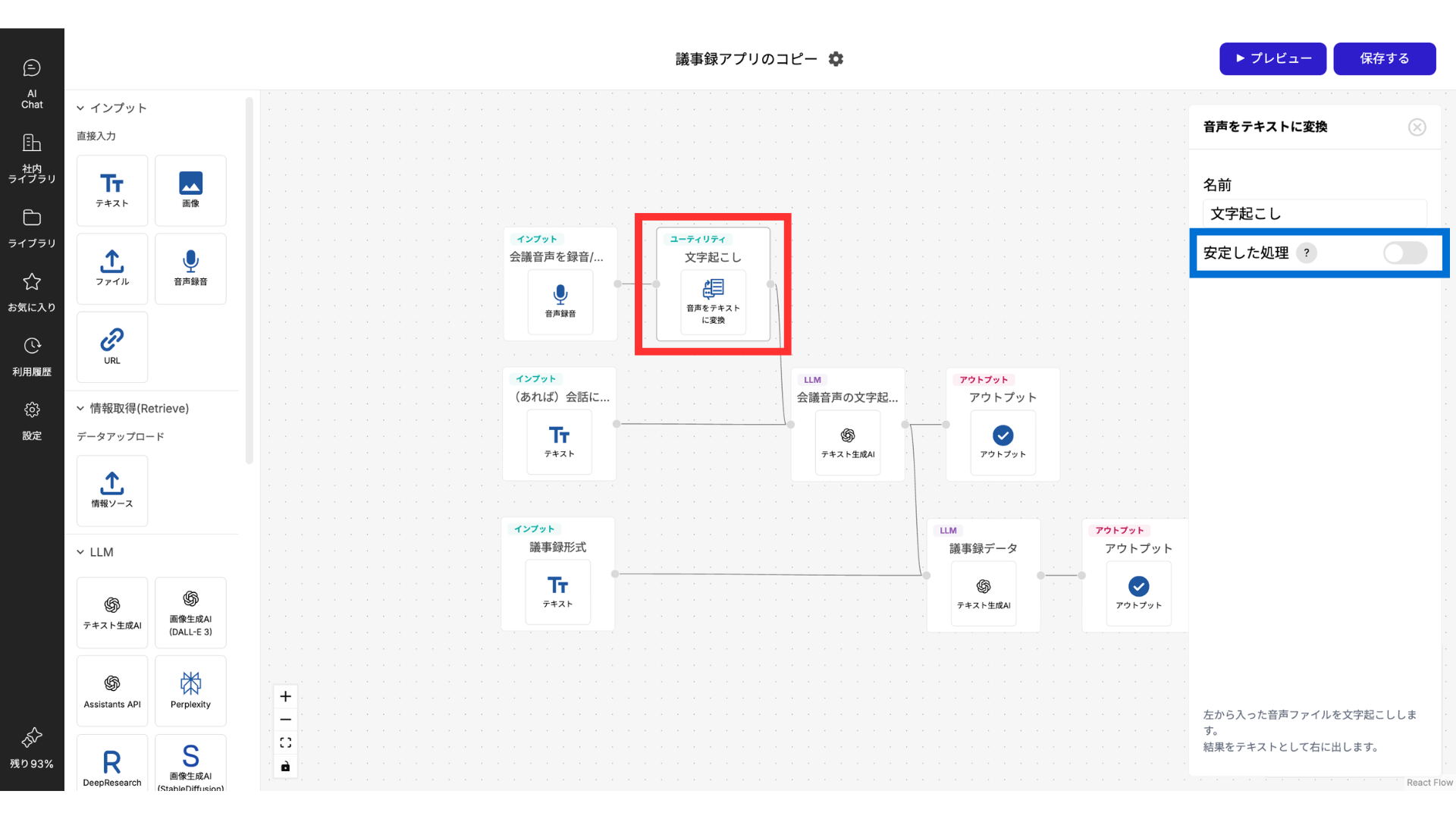 議事録アプリのエラーへの対処法として、編集画面内の「音声をテキストに変換」のユーティリティを選択し、「安定した処理」をオンにしてください。