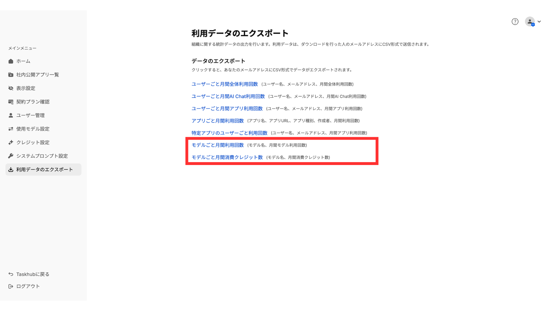 2026年2月18日、Taskhubの管理者画面からアクセスできる「利用データのエクスポート」から、「モデルごとの月間利用回数」と「モデルごとの月間消費クレジット数」を確認できる項目を追加しました。