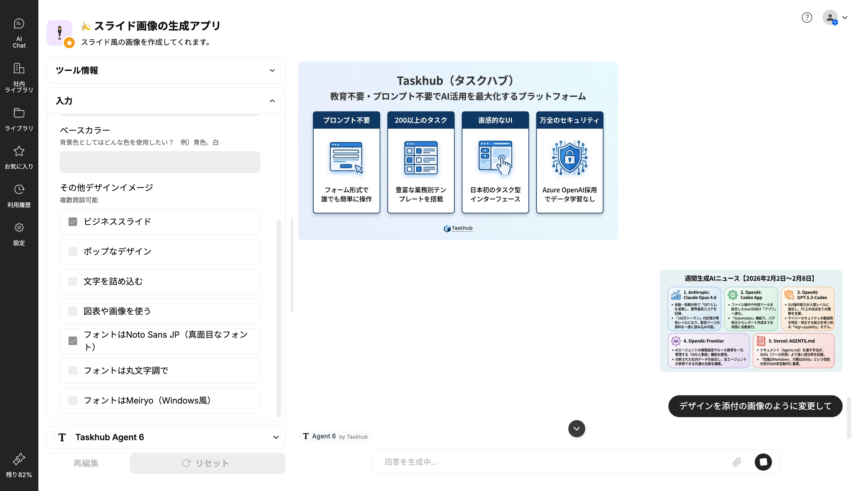 今回のアップデートにより、AI ChatのTaskhub Agentだけでなく、エージェントアプリでも細かな画像の修正や追加ファイルを読み込ませたタスクの実行が可能になります。