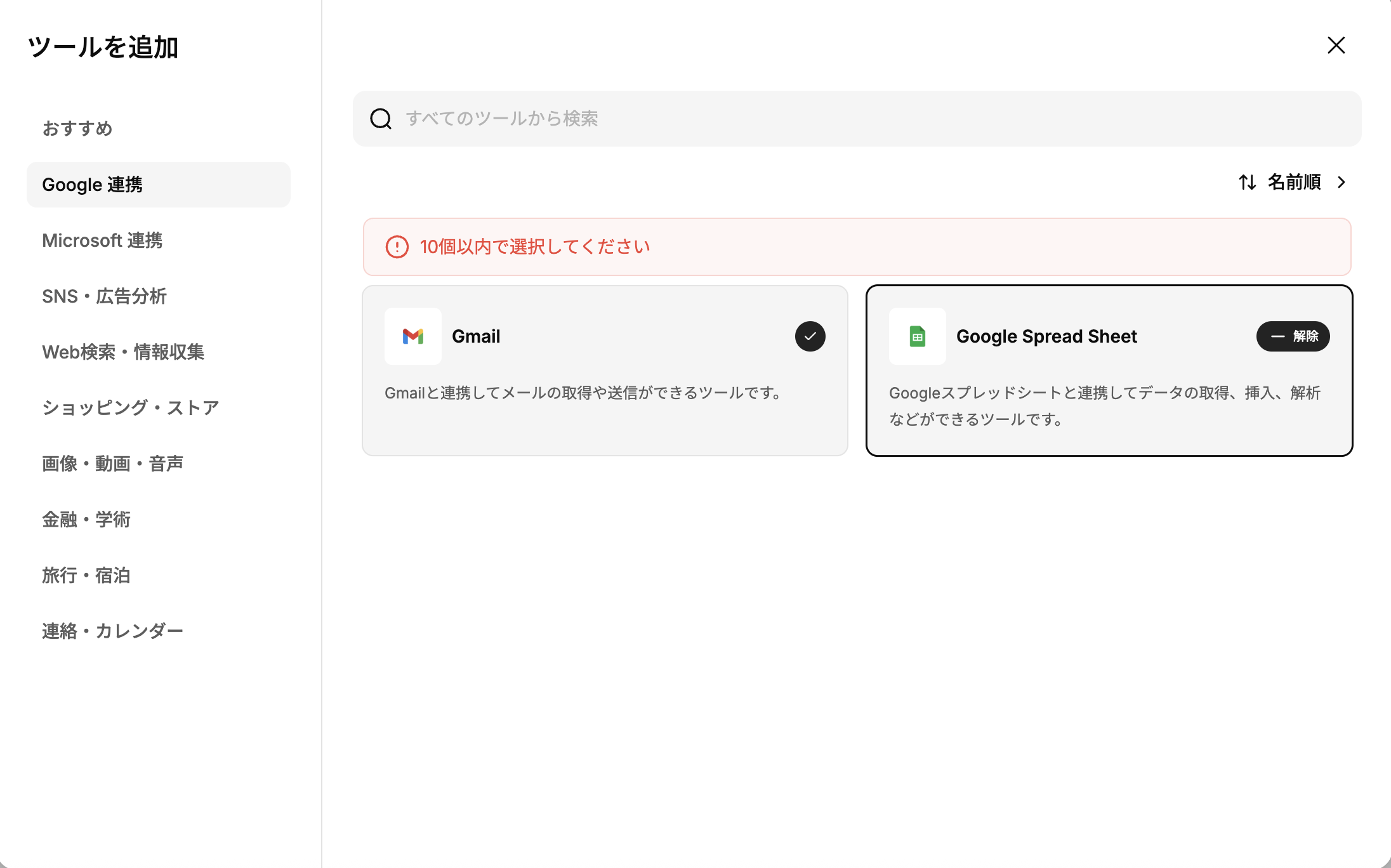 2026年2月8日、エージェントアプリでツール量が10個を超えると、エラーメッセージが表示されるようになりました。