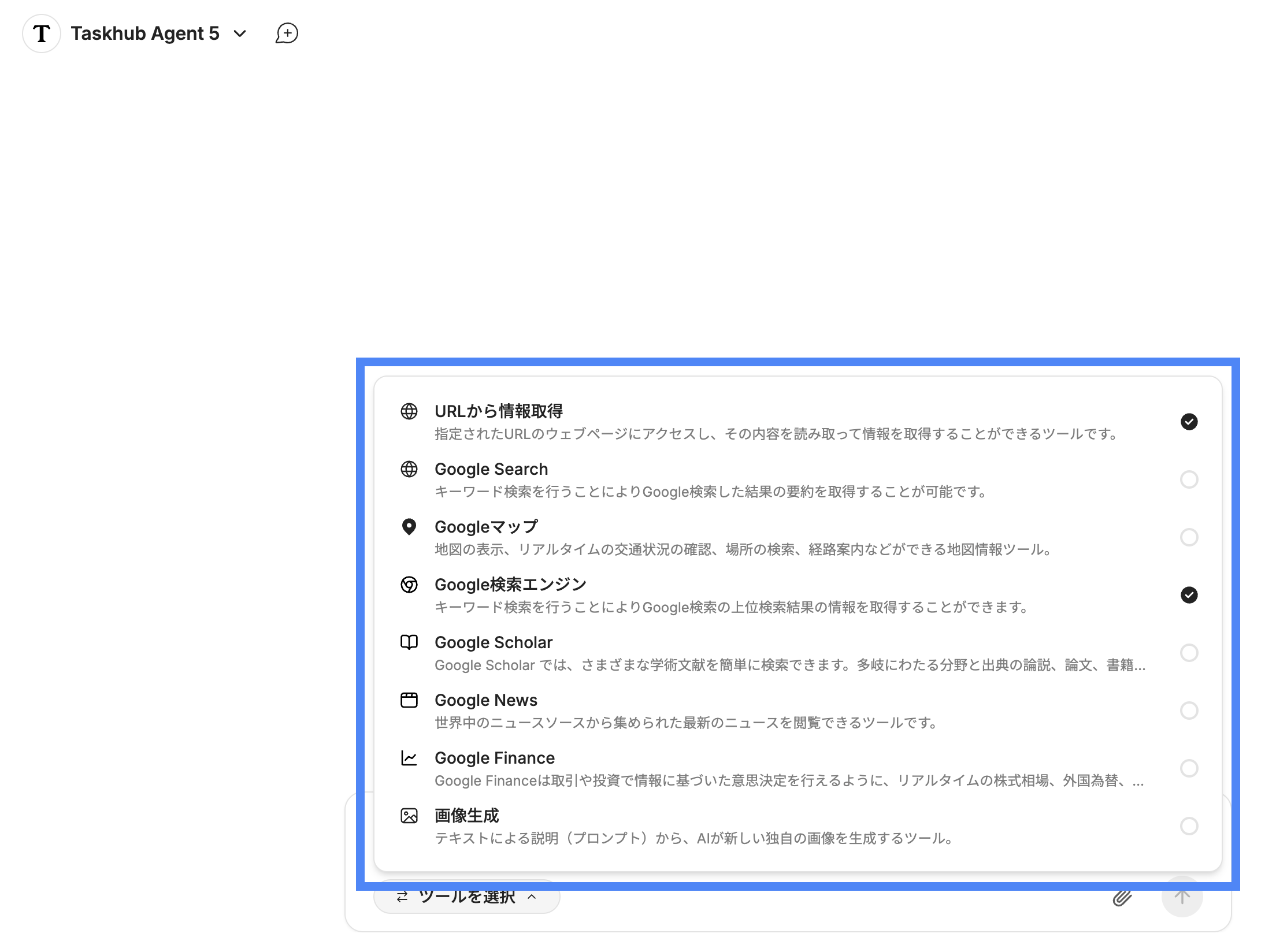AI Chat画面で「Taskhub Agent」を選択し、「ツールを選択」をクリックすると利用したいツールを選択・追加できます。