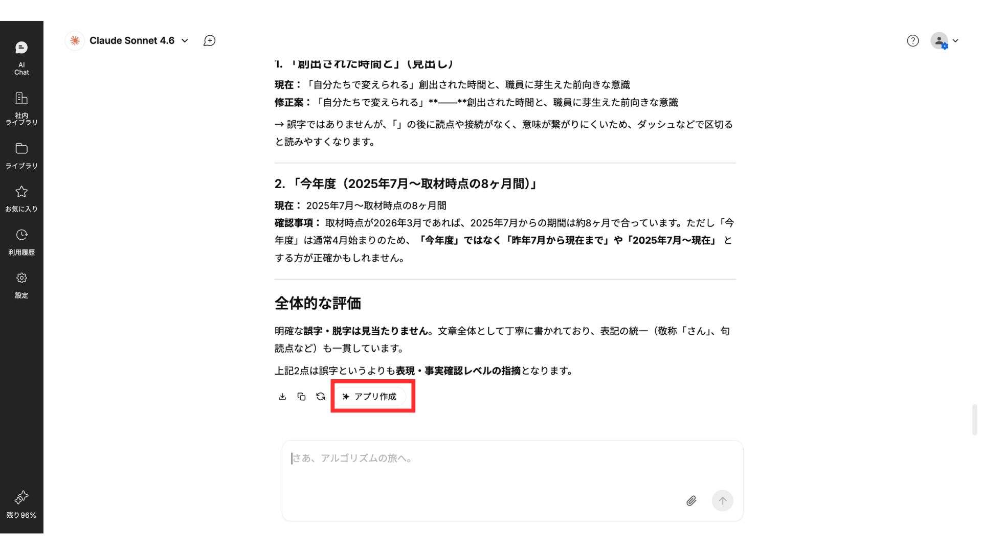 チャット内のAIからの回答の下部にある、「アプリを作成」のボタンをクリックすることで、エージェントアプリをAIが自動作成します。