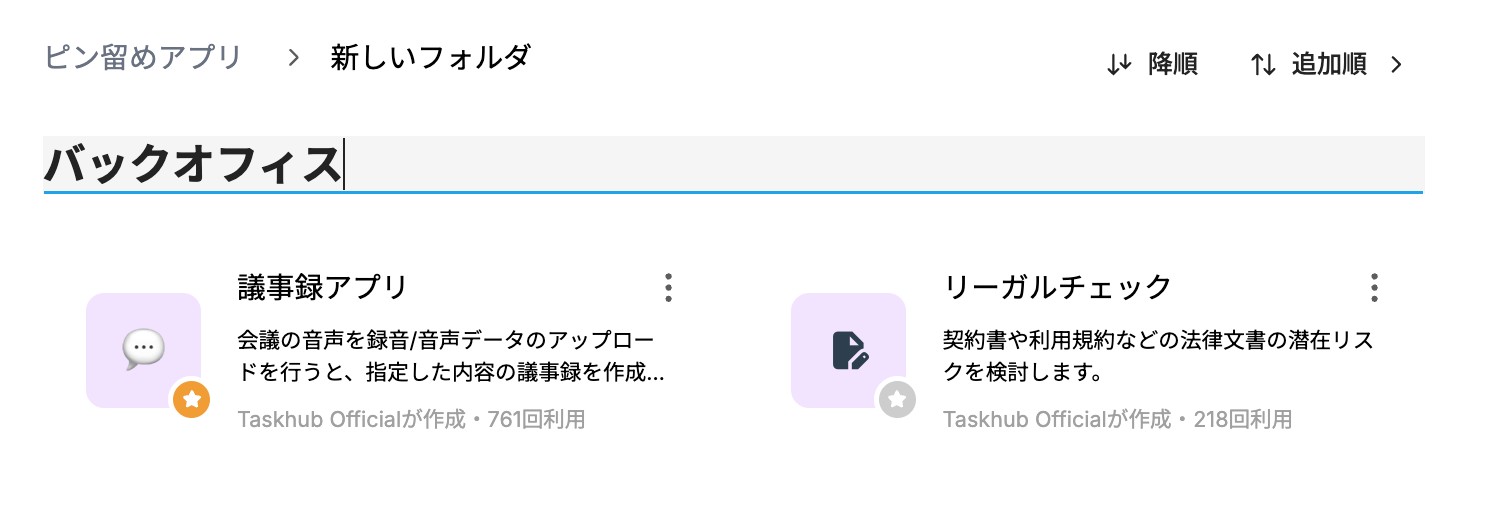 社内ライブラリ上部に表示されているピン留めアプリをフォルダで分類できるようになりました。これにより、部署や業務ごとにアプリを整理し、さらに使いやすくなります。(owner / admin権限ユーザーのみ可能)