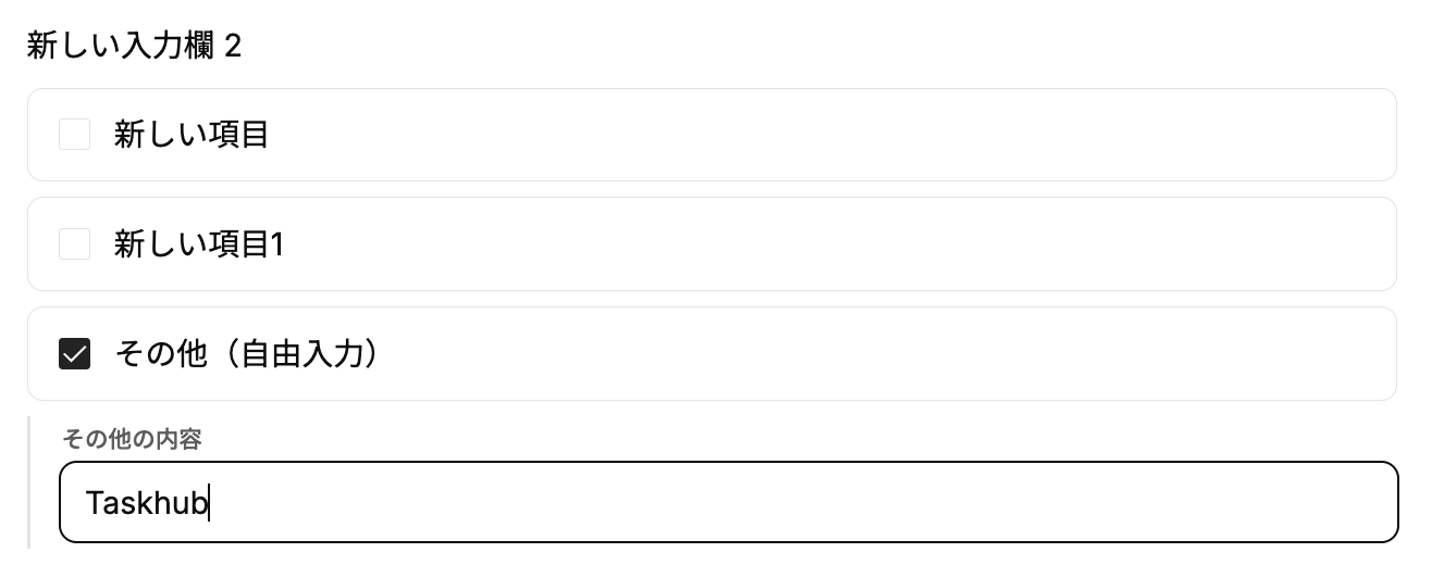 入力フォームとしてラジオボタン/チェックボックスを追加後、「その他を表示」をONにすることで、自由入力欄を追加することができます。
